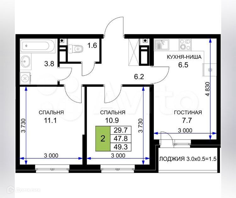 Общая площадь 49.3 м2