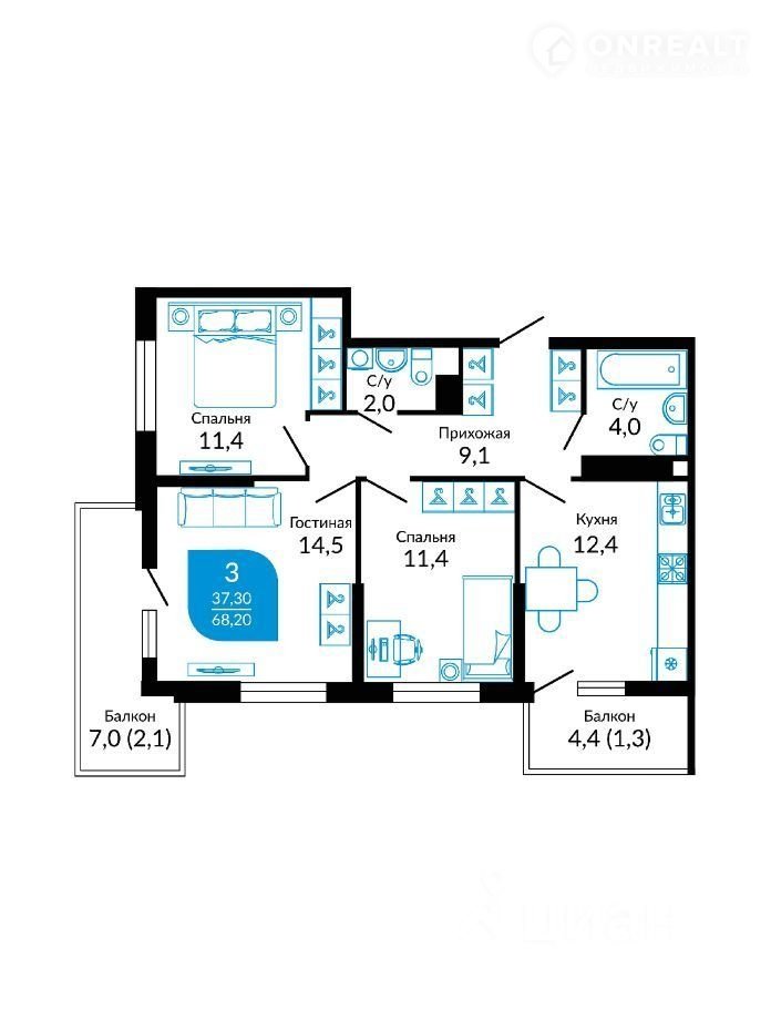 Общая площадь 68.2 м2