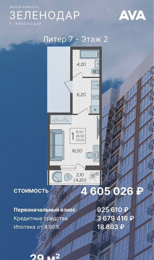 Квартира студия, 29.9 м2, этаж 6 / 17, на продажу в Краснодаре, улица Садовое Кольцо, 1