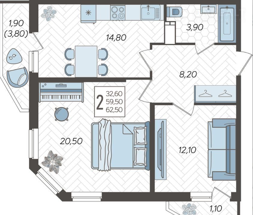 Общая площадь 62.5 м2