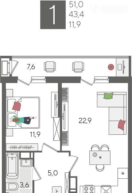 Общая площадь 51 м2