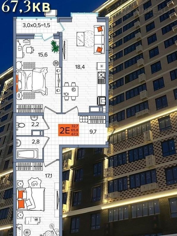 Общая площадь 67.5 м2