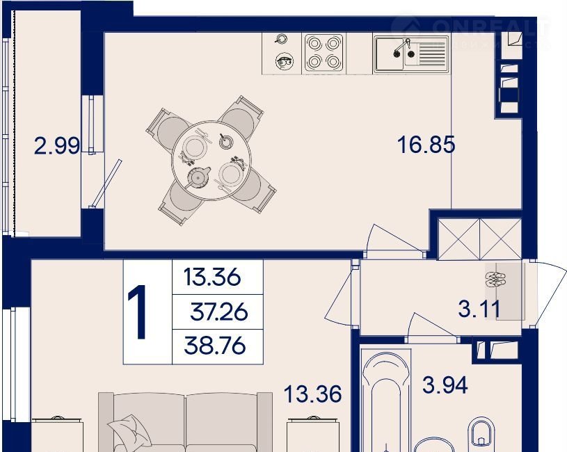 Общая площадь 38.8 м2