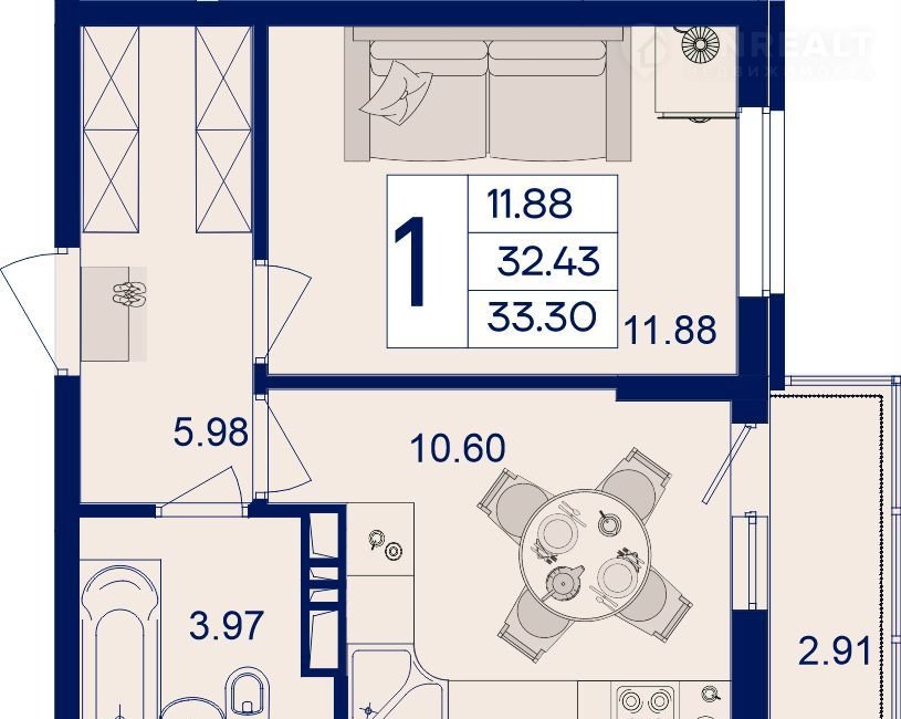 Общая площадь 33.3 м2