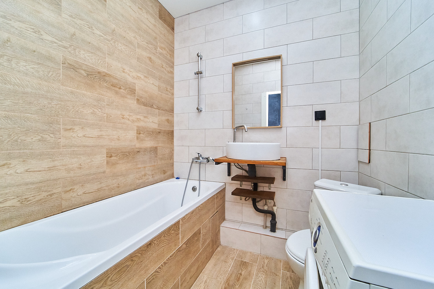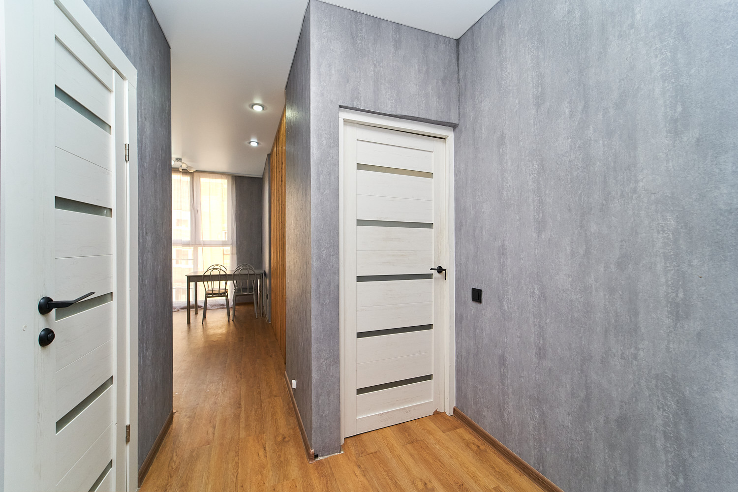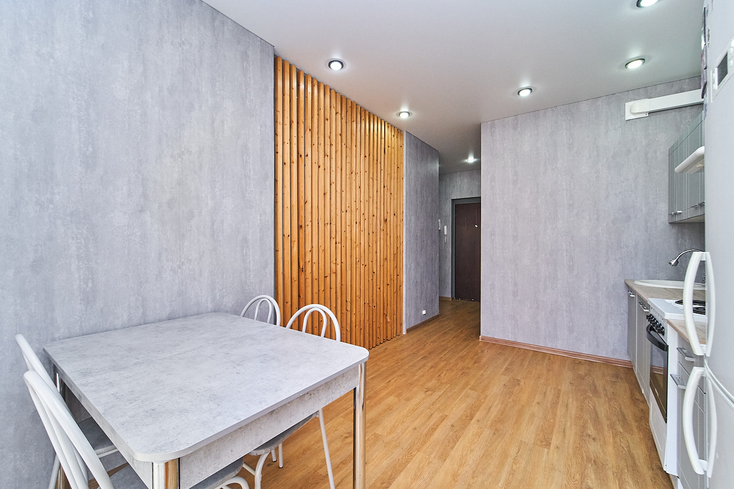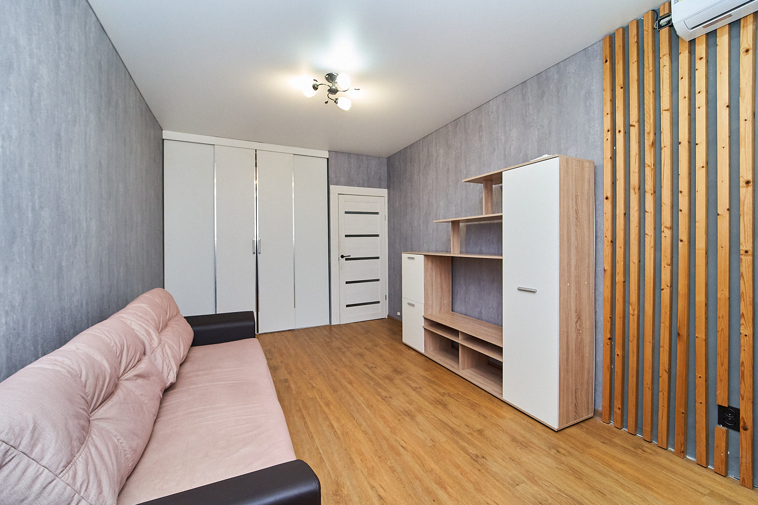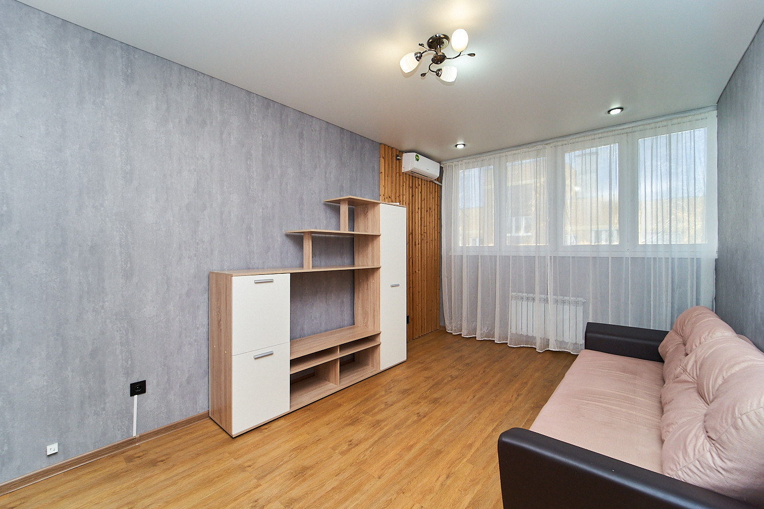 На всей площади квартиры натяжной потолок, пол из пвх-плит, большая кухня с панорамным окном от застройщика, укомплектована всем необходимым кухонным гарнитуром и мебелью. В основной комнате есть отдельная большая гардеробная, а также есть раскладной диван, сплит-система и стенка с ЖК-телевизором. Ванная комната выполнена из керамогранита, ванна акриловая и есть стиральная машина.