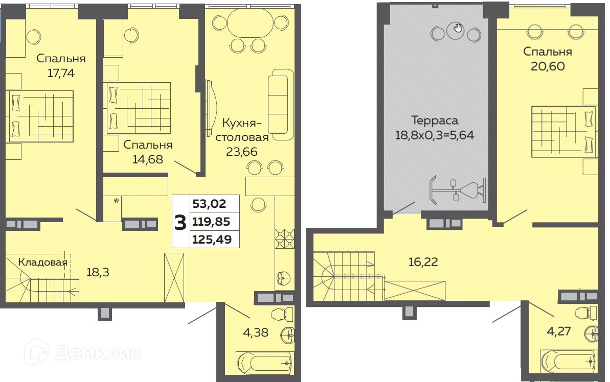 Продаётся великолепный 2-этажный пентхаус на 18/19 этаже дома комфорт класса. Общая площадь 126 м2, площадь комнат 18, 21, 15 м2, кухня 23 м2. В квартире выполнена качественная предчистовая отделка. Высота потолков (1 этаж - 3,6 м, 2 этаж - 2.8 м) создает ощущение простора. По проекту предусмотрены два санузла. Квартира обладает отличными видовыми характеристиками. Из окон и террасы (19 м2) открывается чудесный вид на город. Панорамное остекление (от пола до потолка) открывает чудесный вид на город и наполняет каждый уголок квартиры солнечным светом. В доме 3 высокоскоростных лифта.  На первом этаже коммерческие помещения (магазины, кафе, сфера обслуживания).