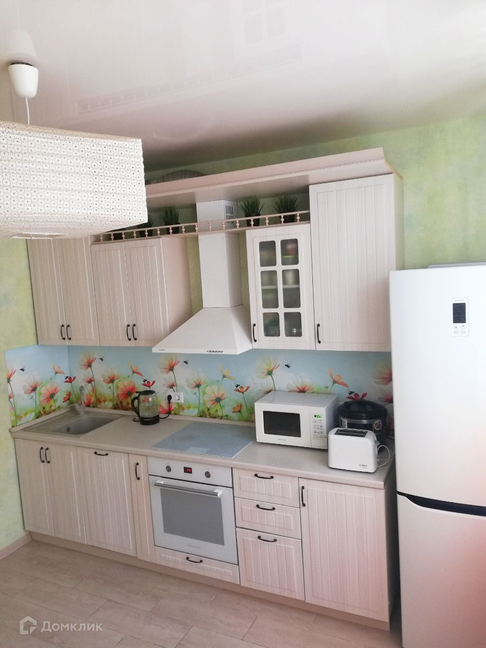 Дорогие моющиеся обои на кухне, встроенная техника, которая прослужит будущему покупателю долгое время. Посудомойка, Варочная поверхность, духовка.