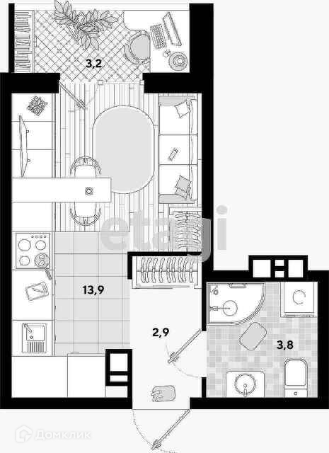 Общая площадь 23.3 м2