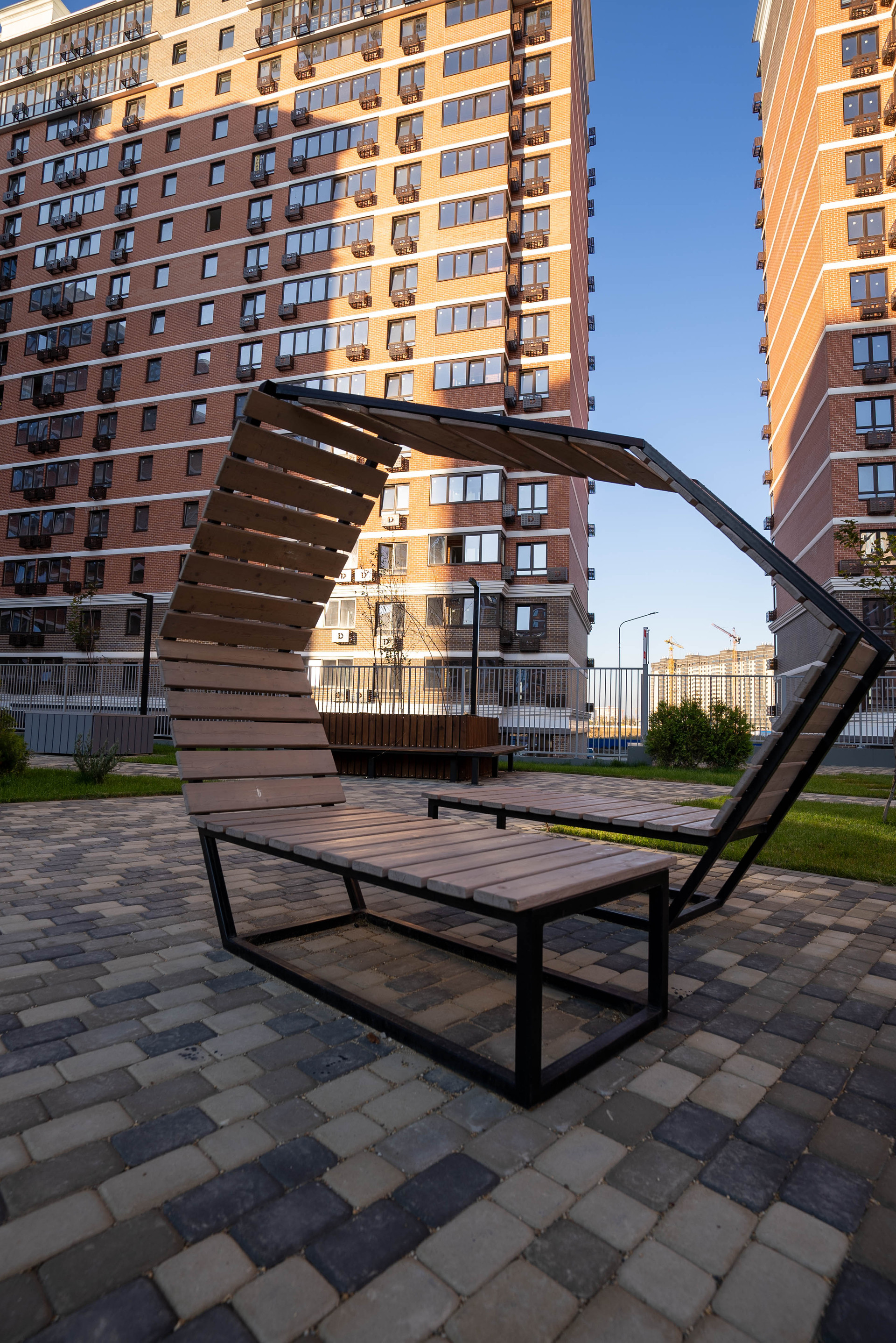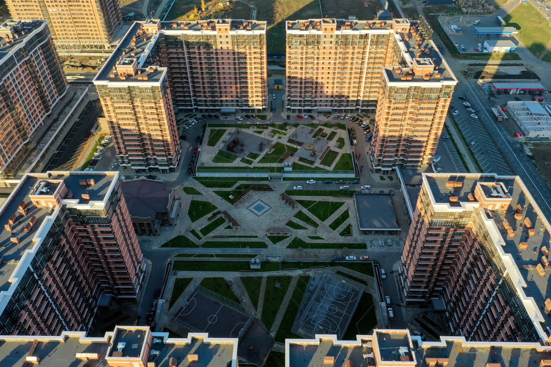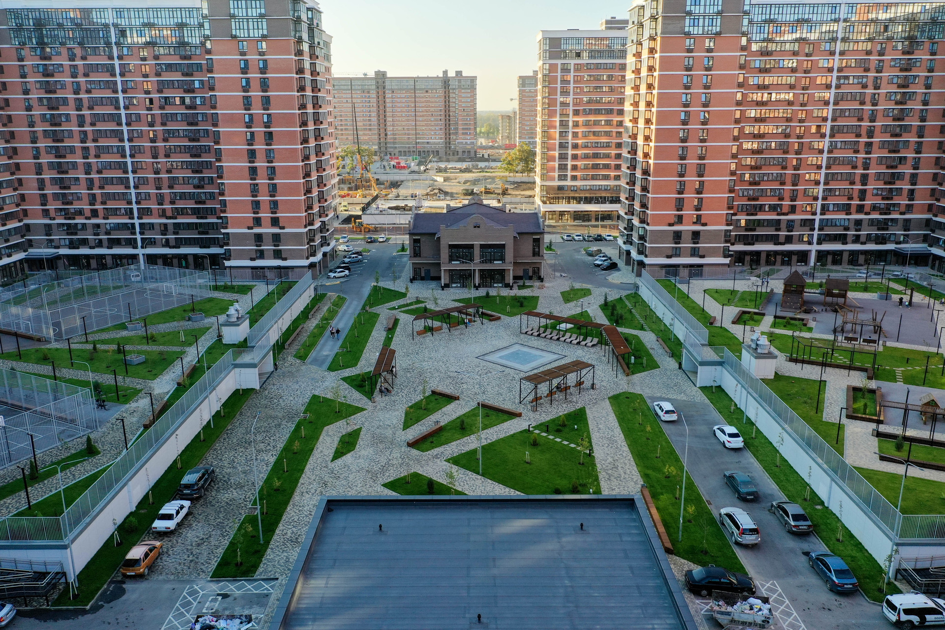 Придомовая территория комплекса оборудована как местами совместного отдыха так и спортивными площадками.