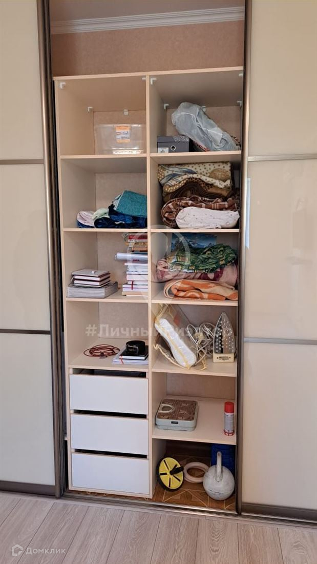 Встроенный объемный шкаф-купе в комнате. Установлен фильтр для воды на кухне.