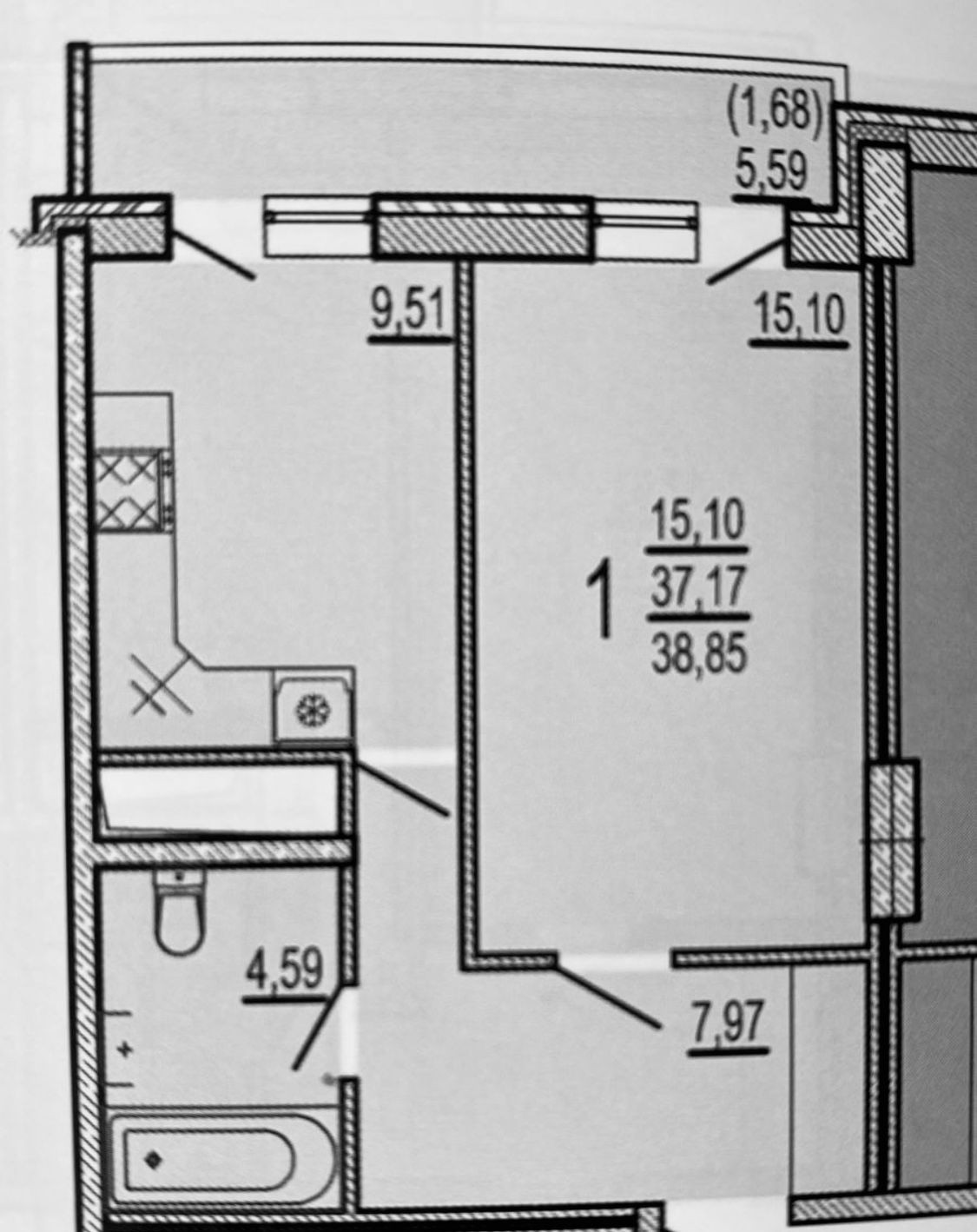 Общая площадь 37.8 м2