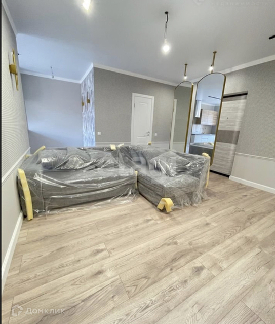 Полы ламинат, плинтус МДФ, окна пластиковые, витраж алюминиевый, двери классические и скрытого монтажа, стены окрашенные+ декоративные обои, при входе установлены декоративные перегородки в виде поворотных зеркал с декором, установлены светильники, люстры, торшеры и трековая система.