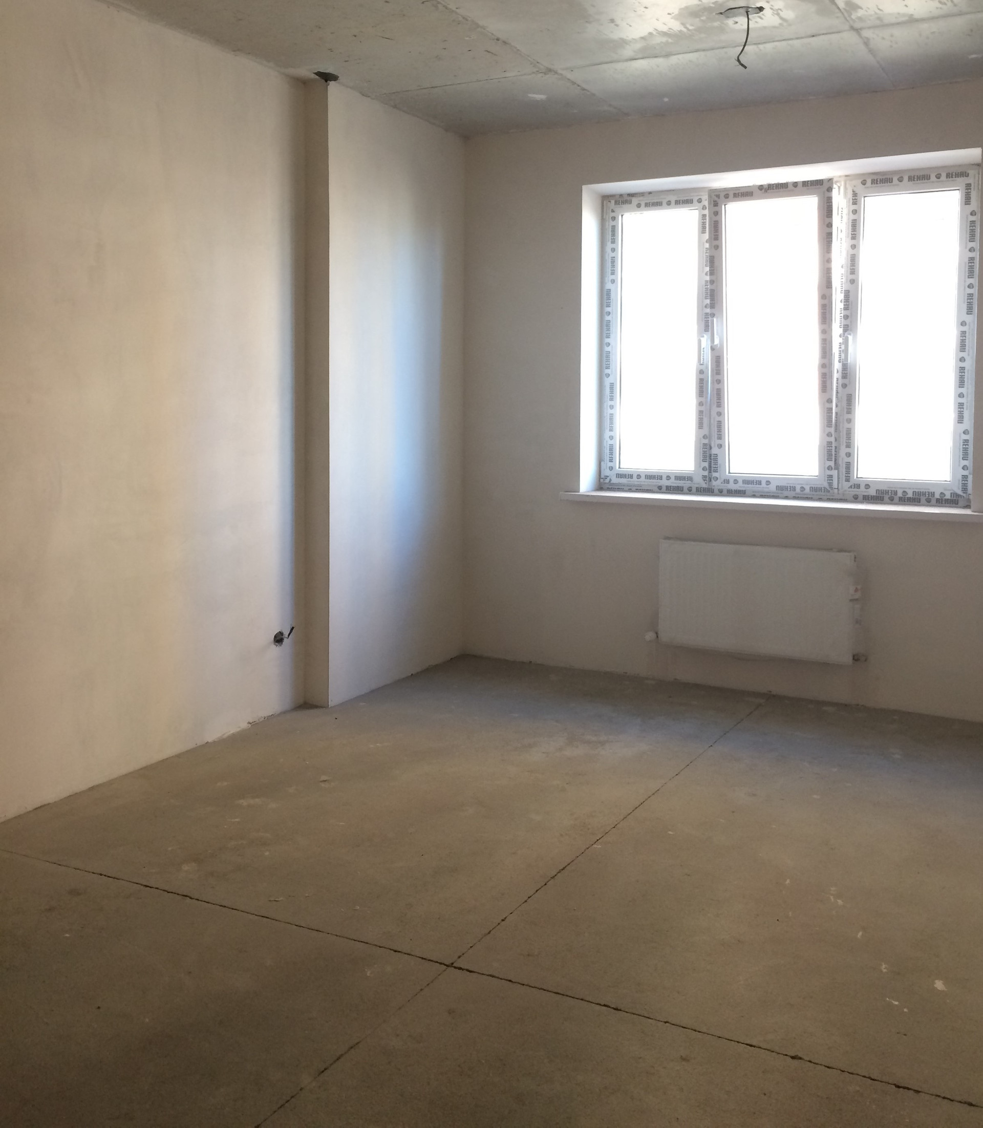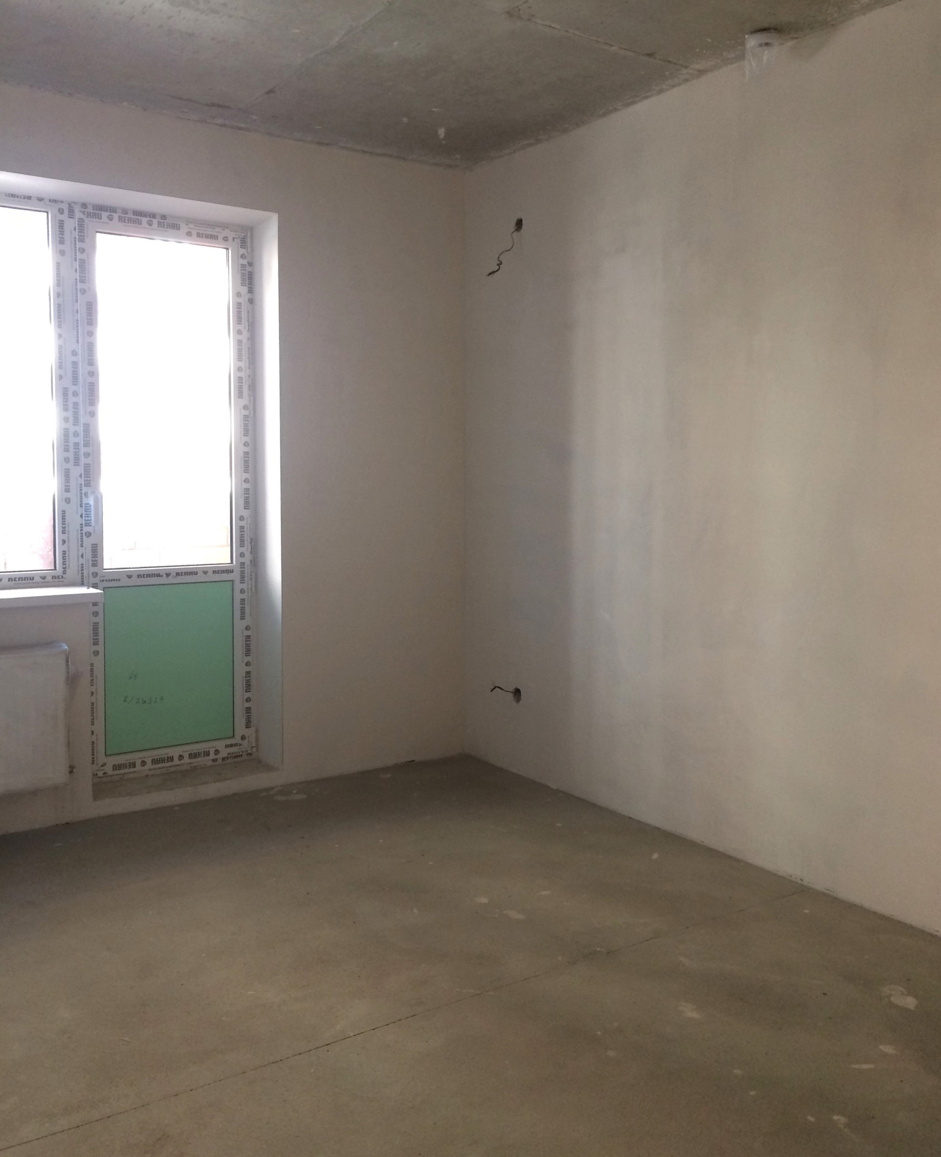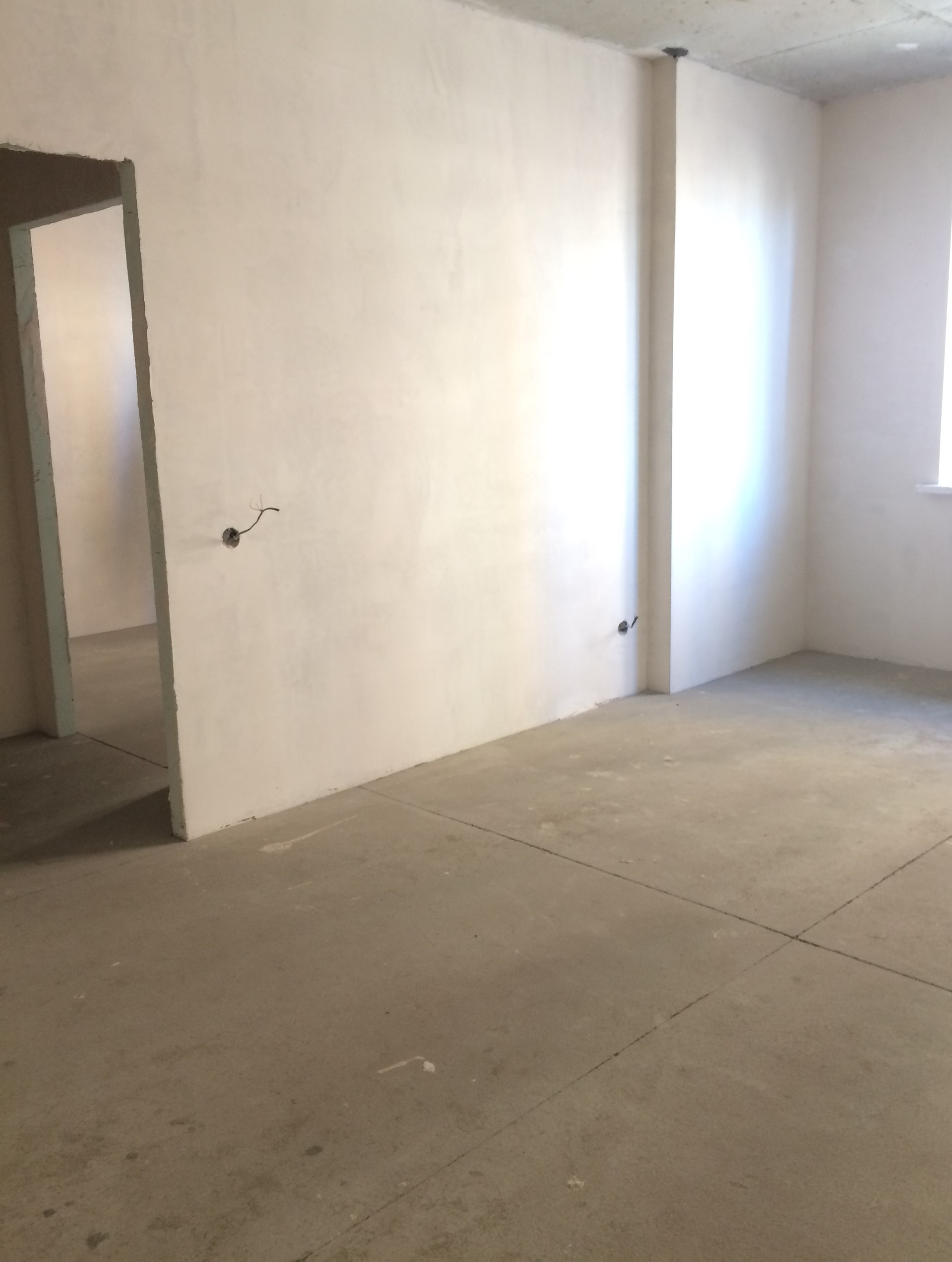 Предчистовая отделка квартиры: стяжка пола, штукатурка стен, электроразводка по всей квартире и радиаторы отопления, без сантехники.