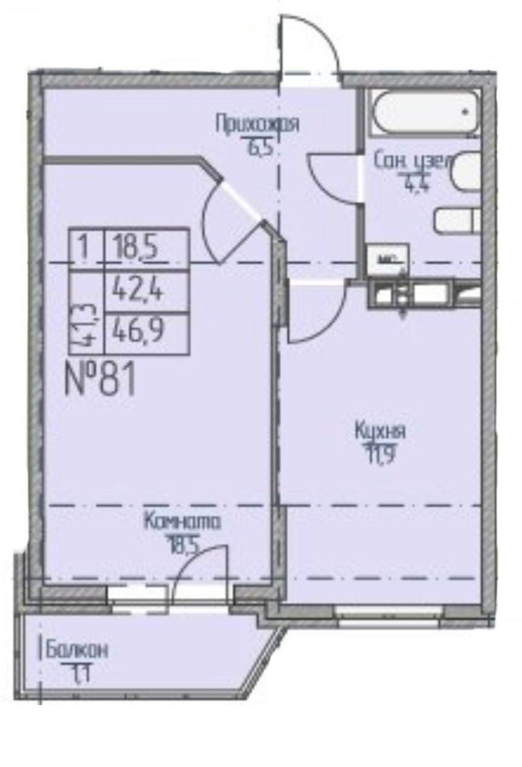 общая площадь 42,7м2 + балкон 4,5 м2 !