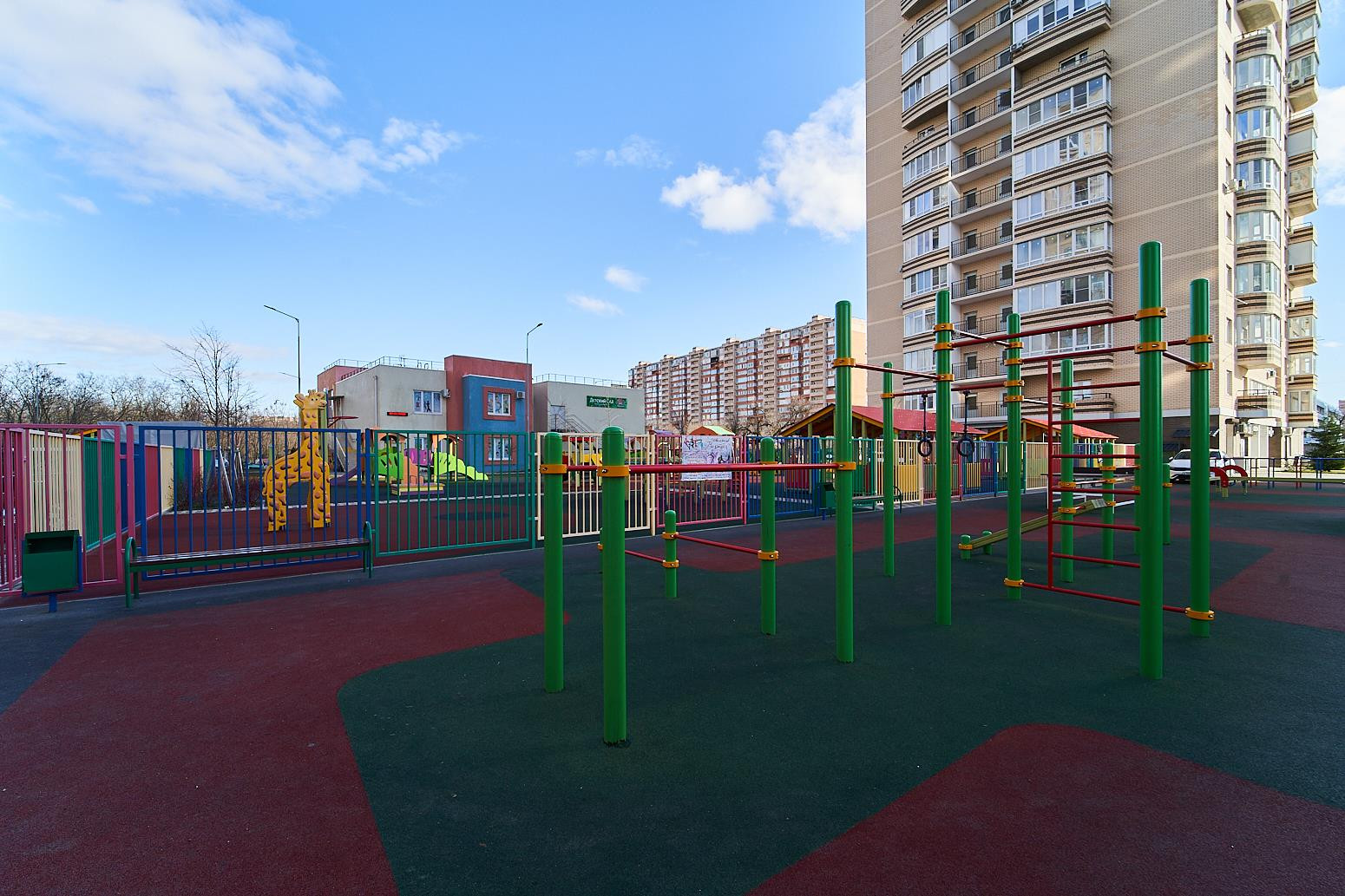 На территории жилого комплекса находятся: семиэтажный паркинг, дополнительные парковочные места, свой детский сад площадью, детские игровые площадки со специальным мягким покрытием площадью, площадки для занятия физической культурой со спортивными снарядами , собственная торговая и социально-бытовая инфраструктура на первых этажах.