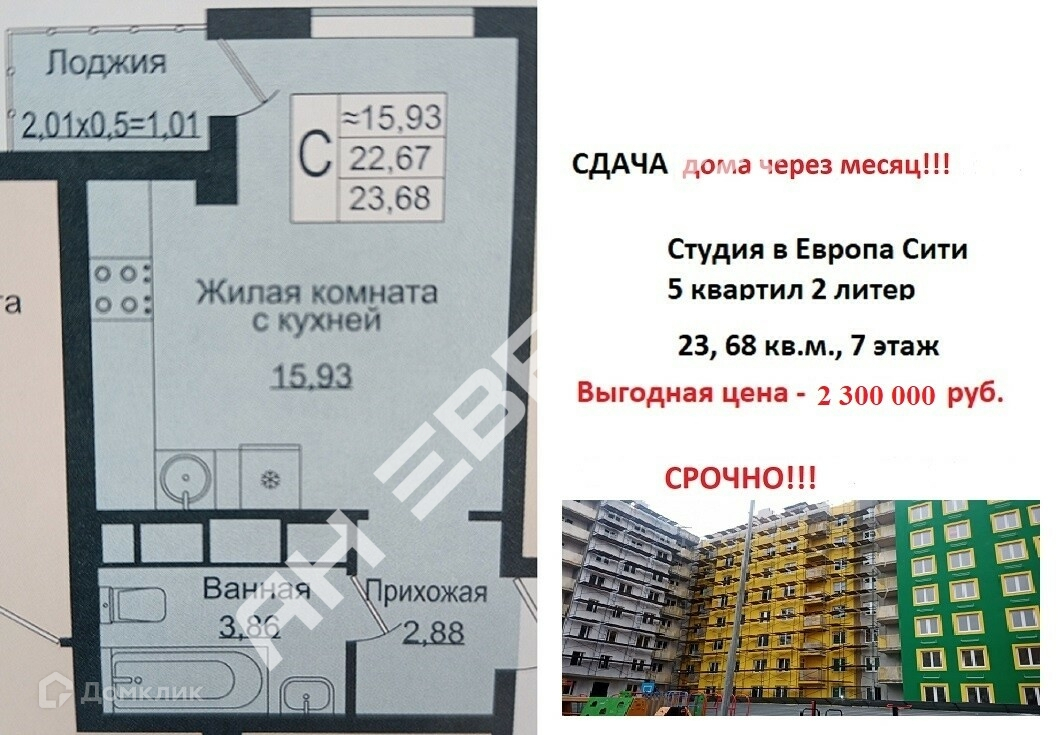 Срочно ЦЕНА снижена!!! Продам студию, окна на детскую площадку, дом уже СДАН, ключи октябрь-начало ноября! ЖК Европа-Сити!