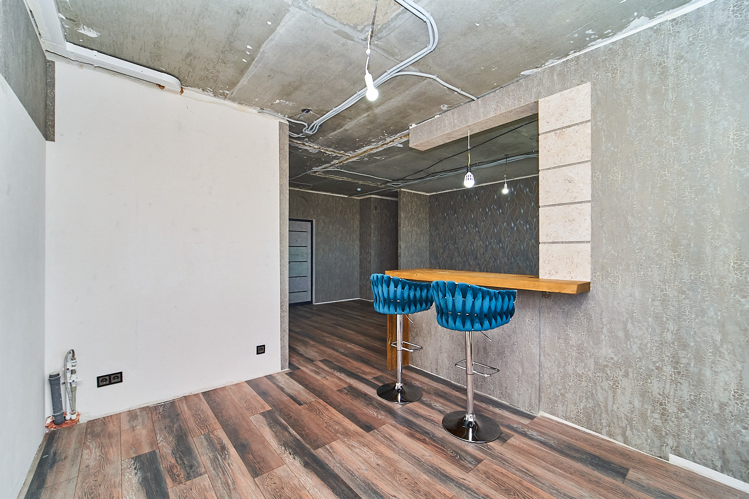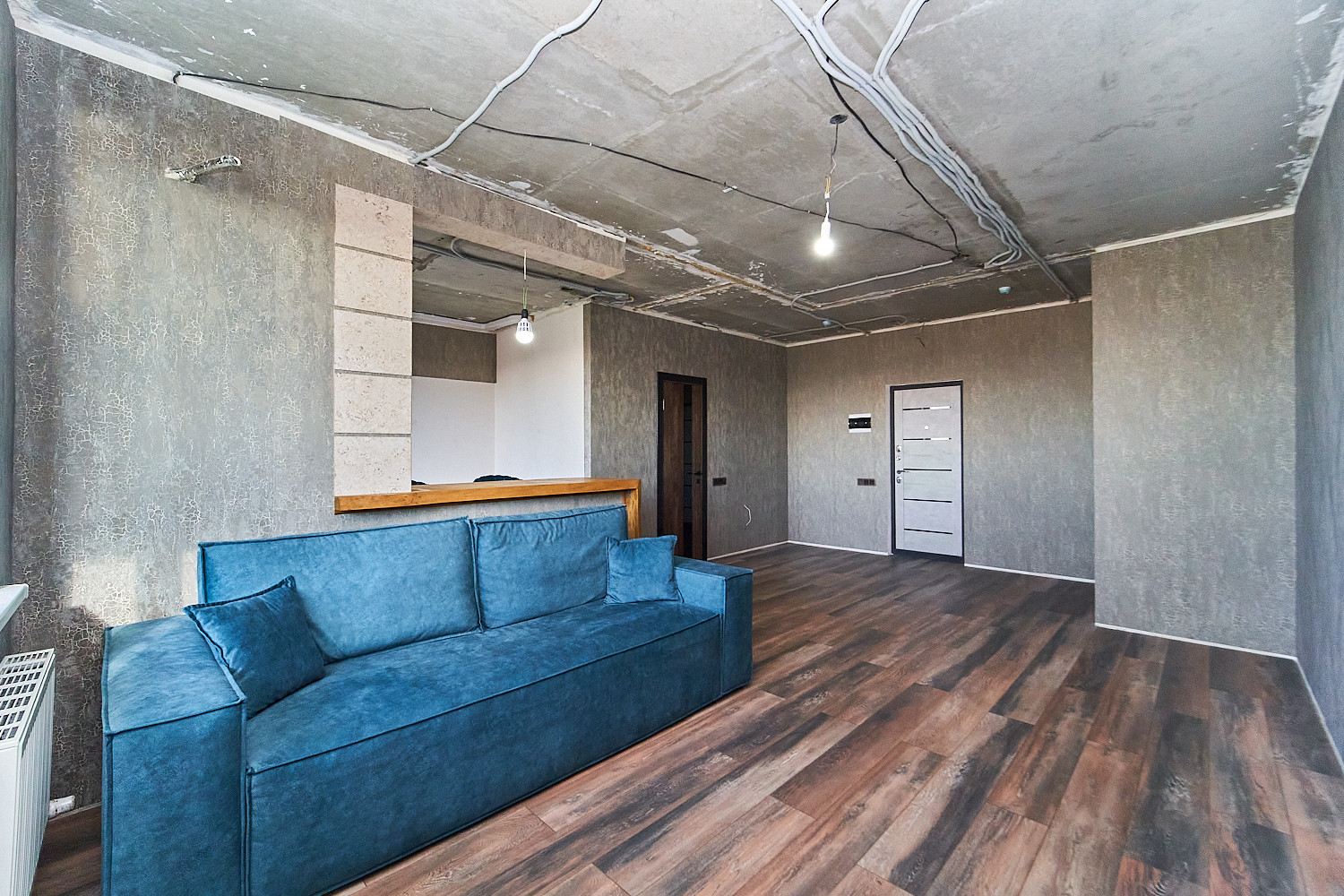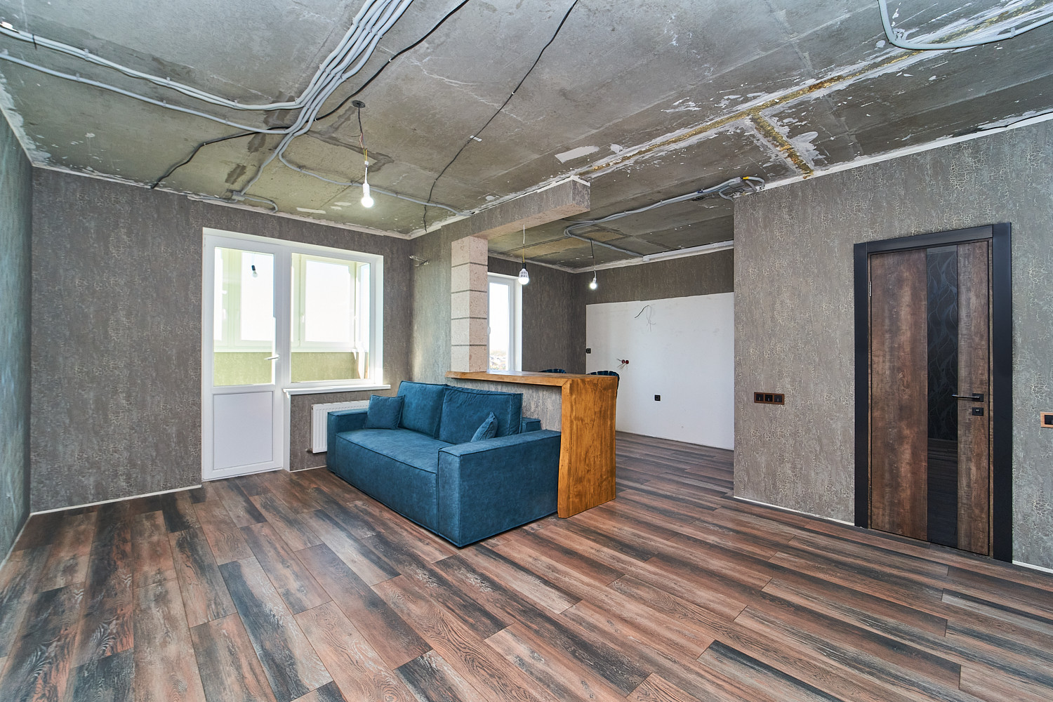 Объединили кухню и одну из комнат и получили шикарную кухню-гостиную, площадью 36 кв.м. Во второй комнате сделали гардеробную. Санузел с ванной комнатой объединили. Балкон застеклен и утеплен, можно организовать зону отдыха с видом на речку. Ремонт выполнен из качественных материалов. Новому собственнику останется заказать потолки и кухню на свой вкус.