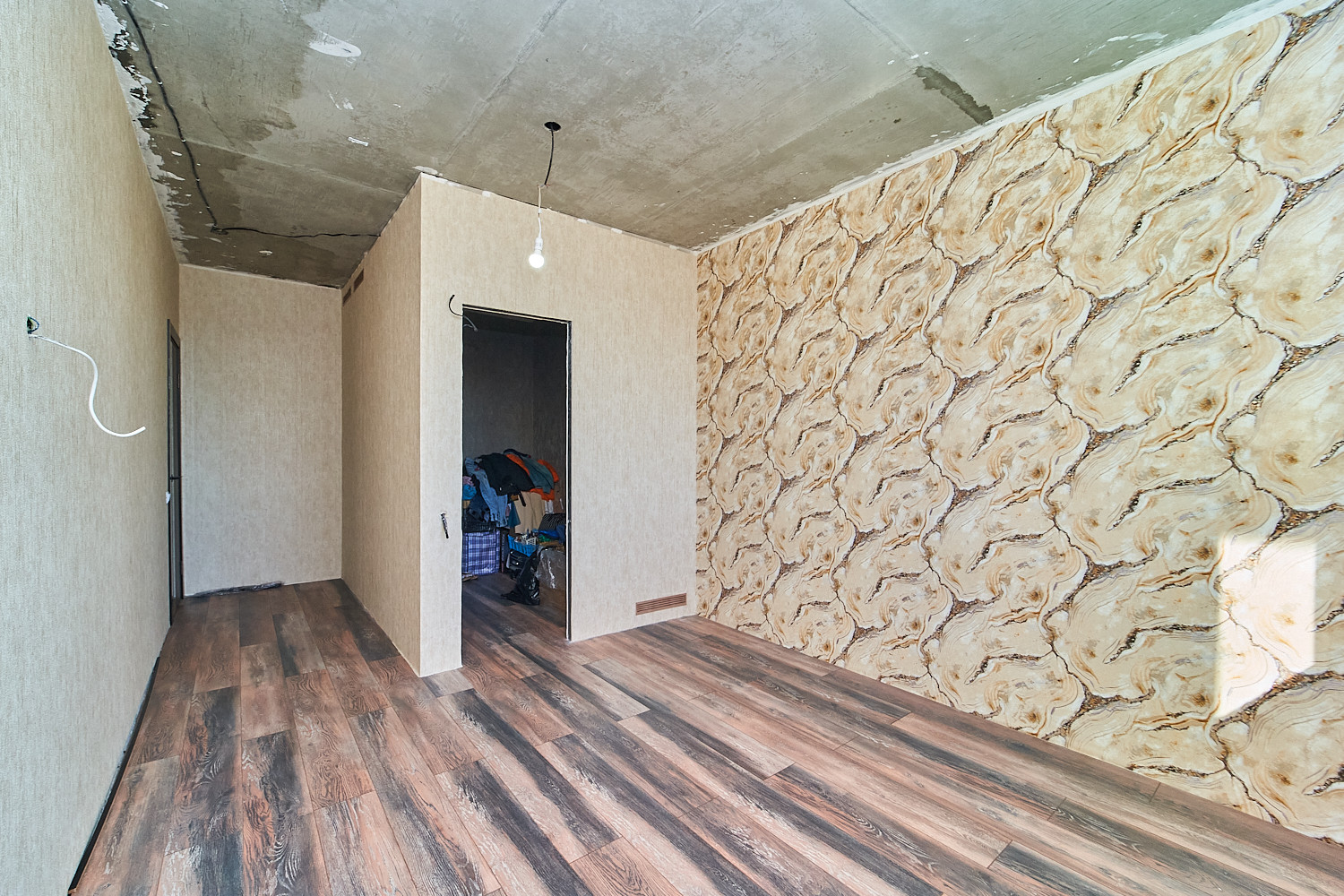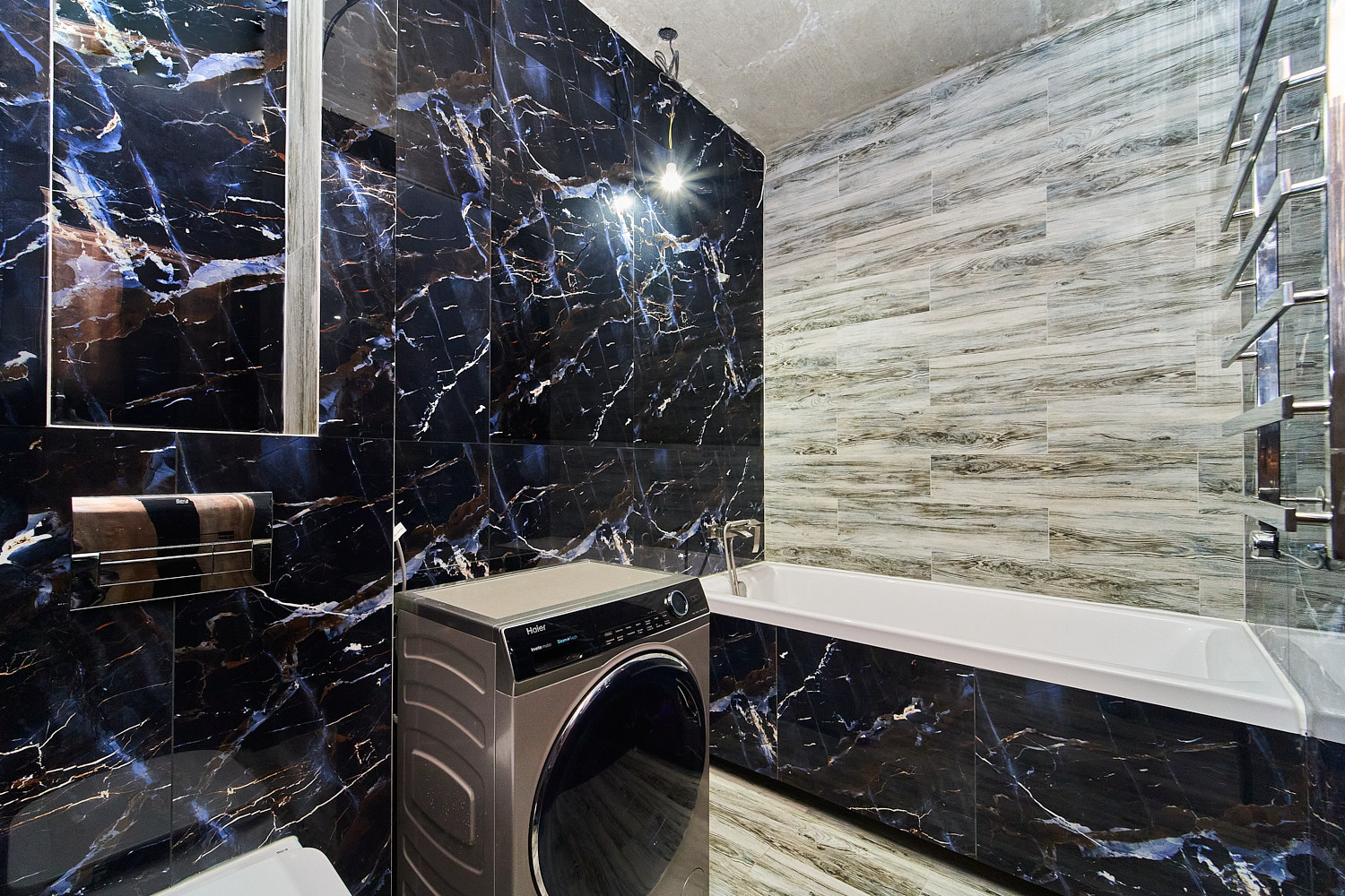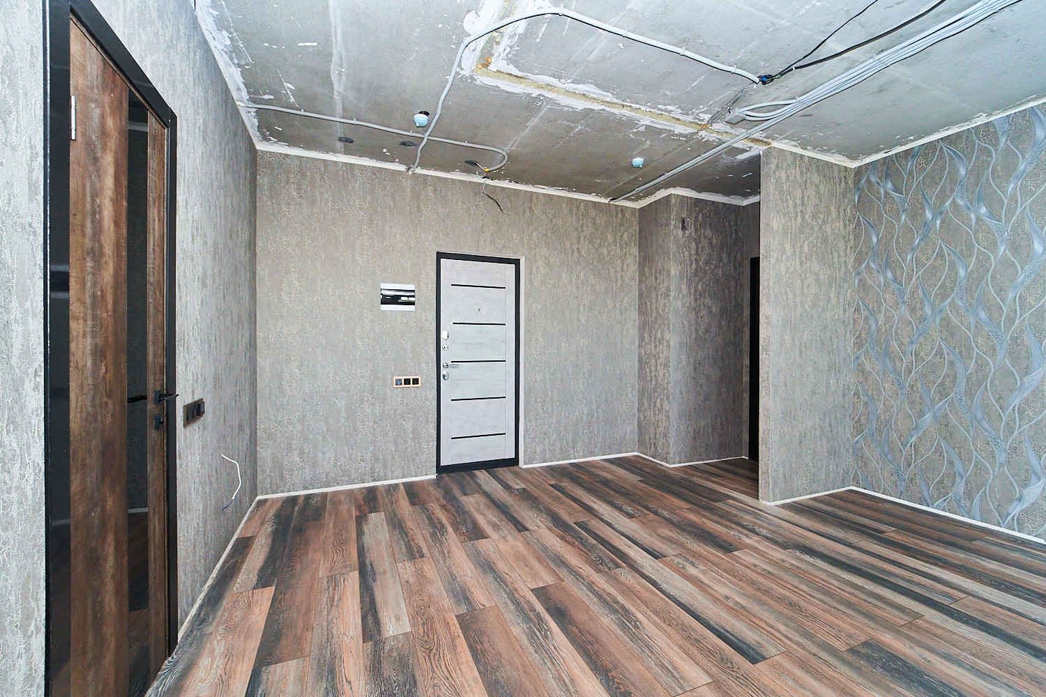 Объединили кухню и одну из комнат и получили шикарную кухню-гостиную, площадью 36 кв.м. Во второй комнате сделали гардеробную. Санузел с ванной комнатой объединили. Балкон застеклен и утеплен, можно организовать зону отдыха с видом на речку. Ремонт выполнен из качественных материалов. Новому собственнику останется заказать потолки и кухню на свой вкус.