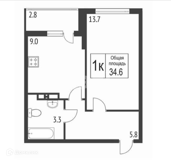 Общая площадь 34.6 м2