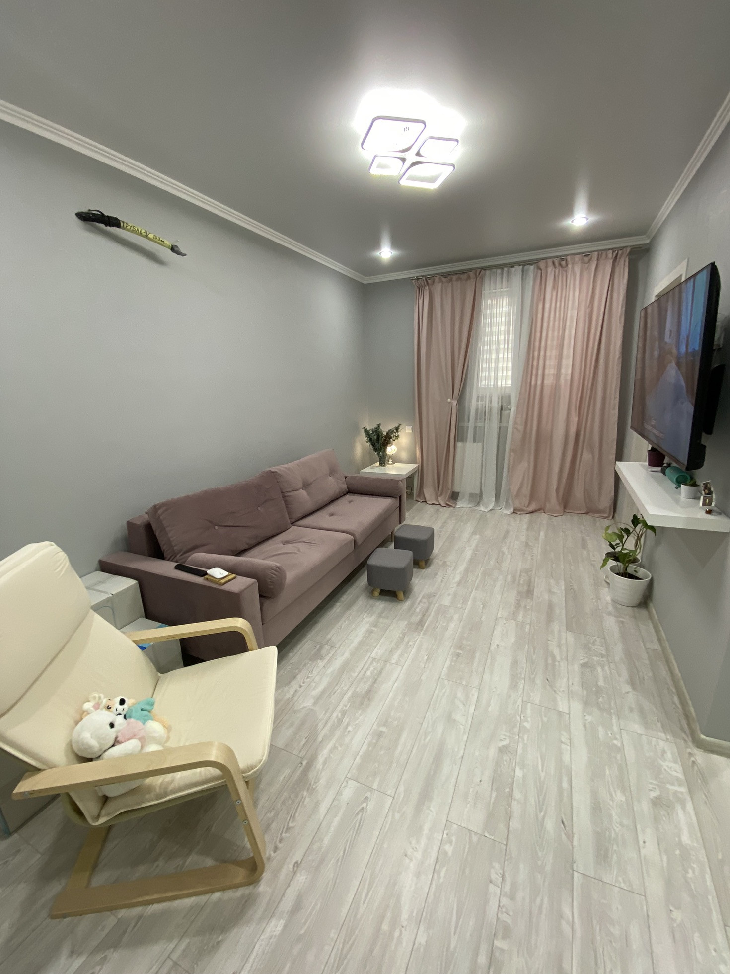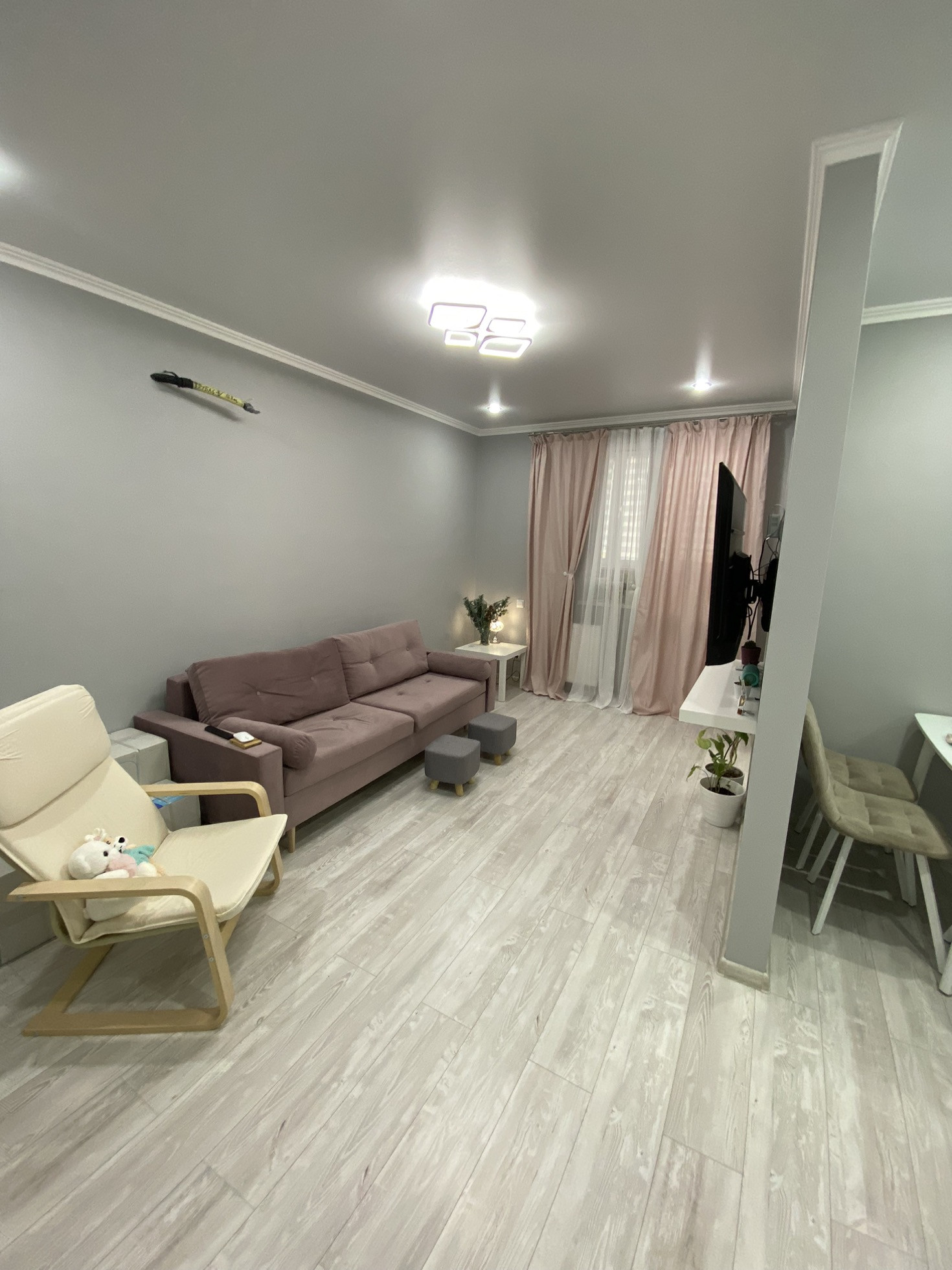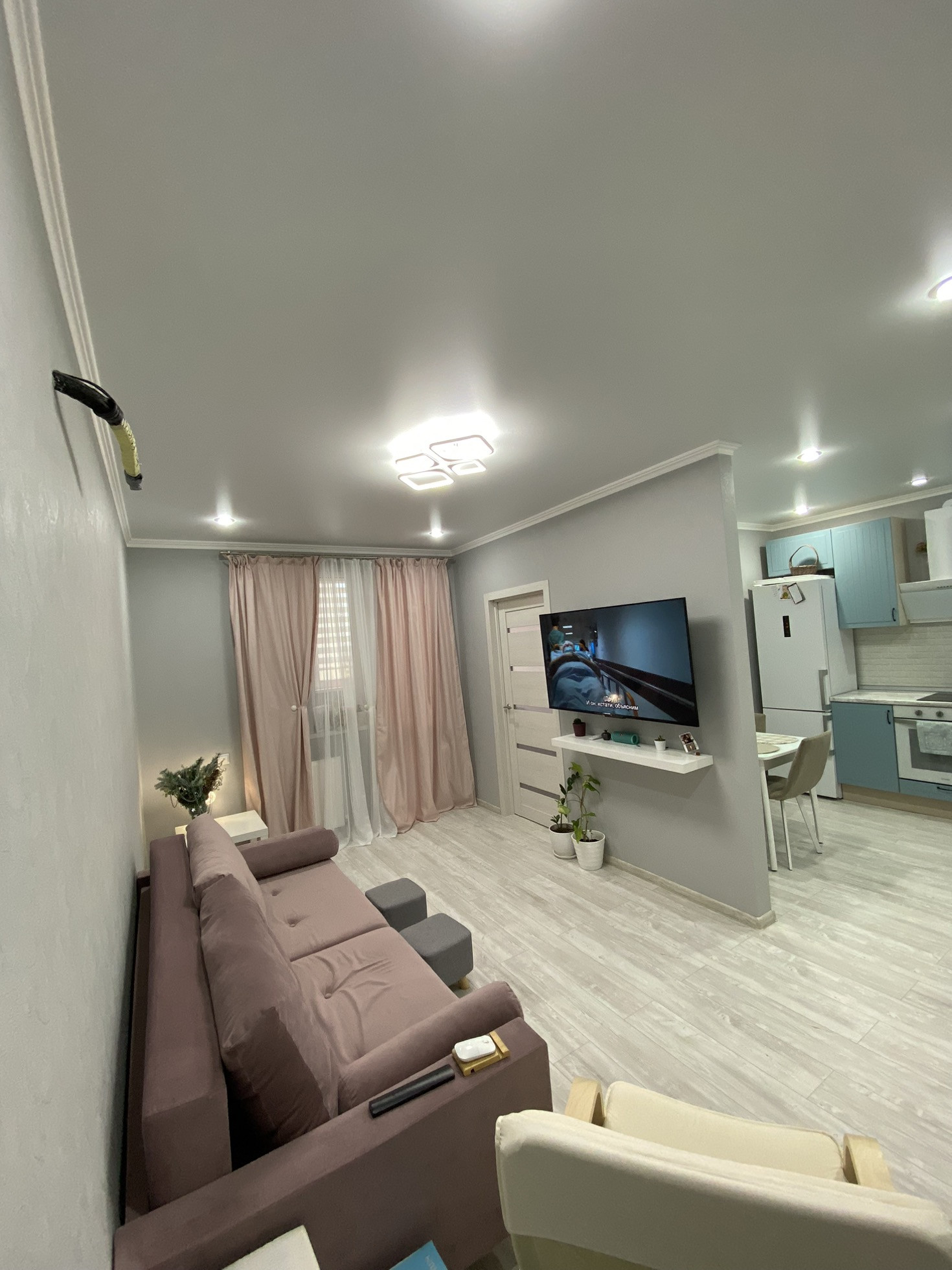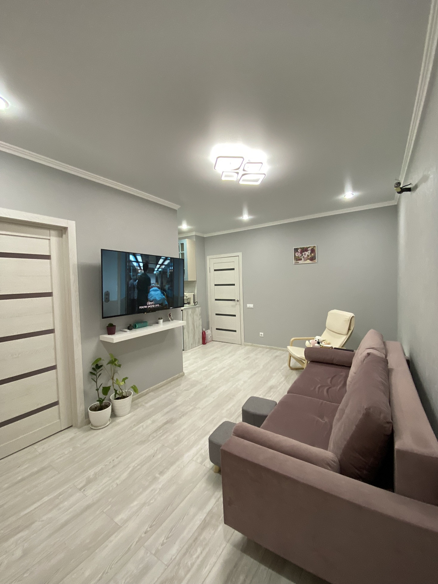 Ремонт на фото, плитка в ванной, ламинат на полу, на стенах обои, потолки натяжные с точечными светильниками и люстрами (на пульте) в коридоре установлен датчик движения. С/у совмещён. Мебель и технику частично оставлю.