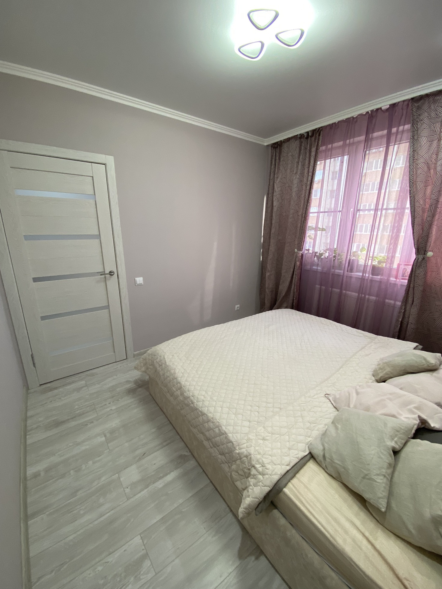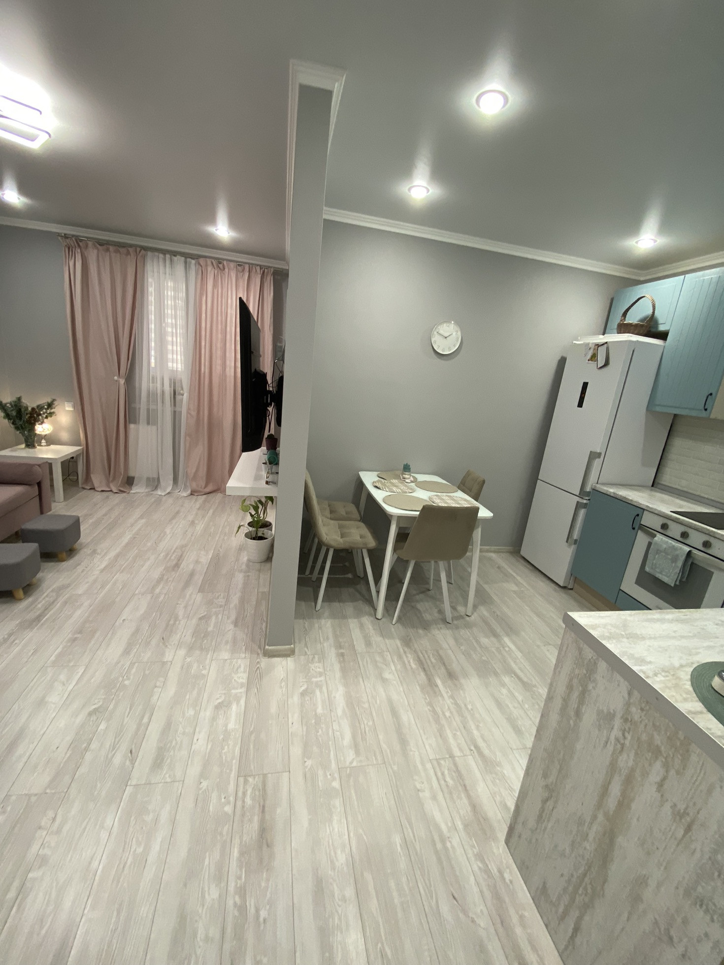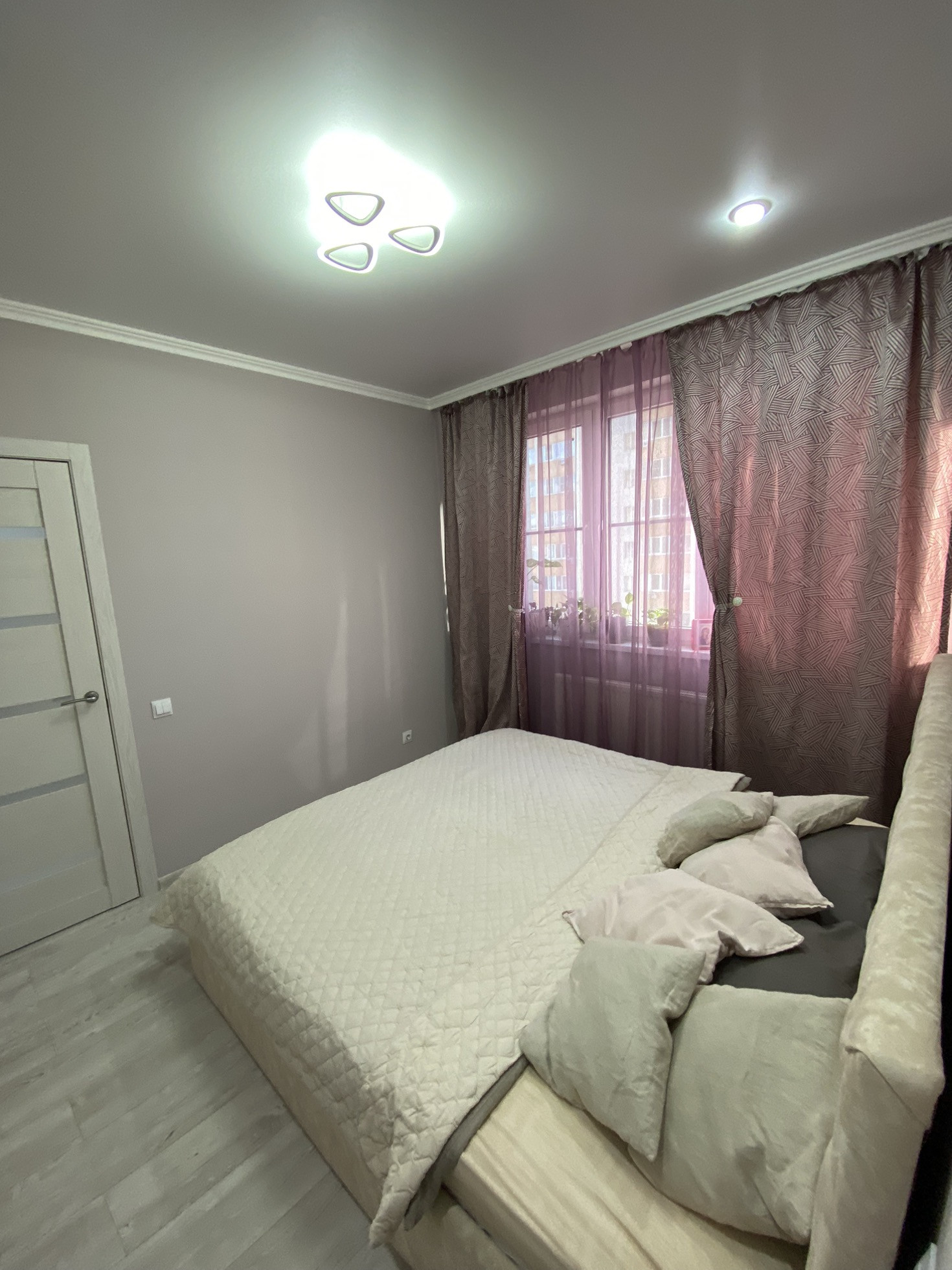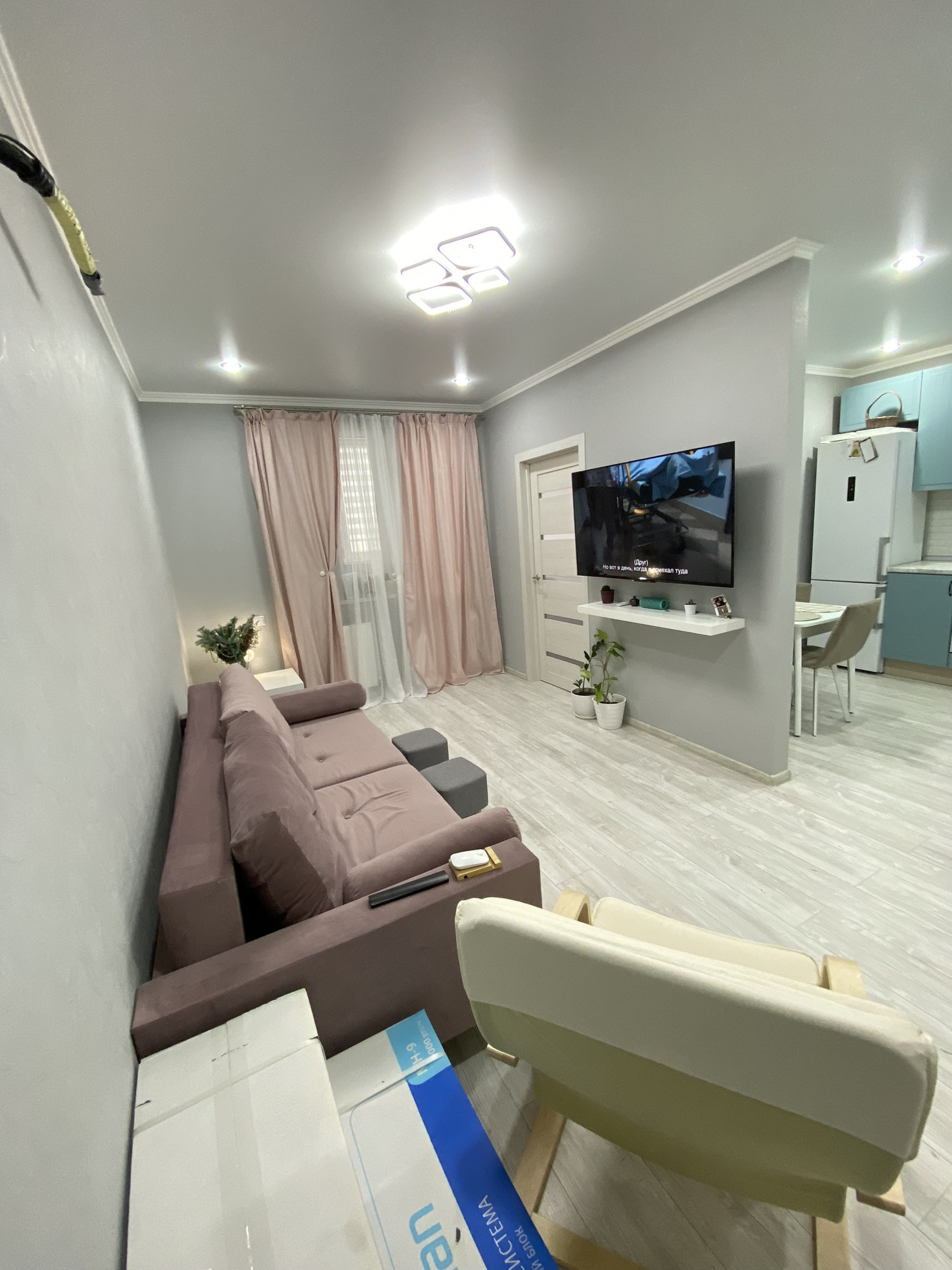Ремонт на фото, плитка в ванной, ламинат на полу, на стенах обои, потолки натяжные с точечными светильниками и люстрами (на пульте) в коридоре установлен датчик движения. С/у совмещён. Мебель и технику частично оставлю.