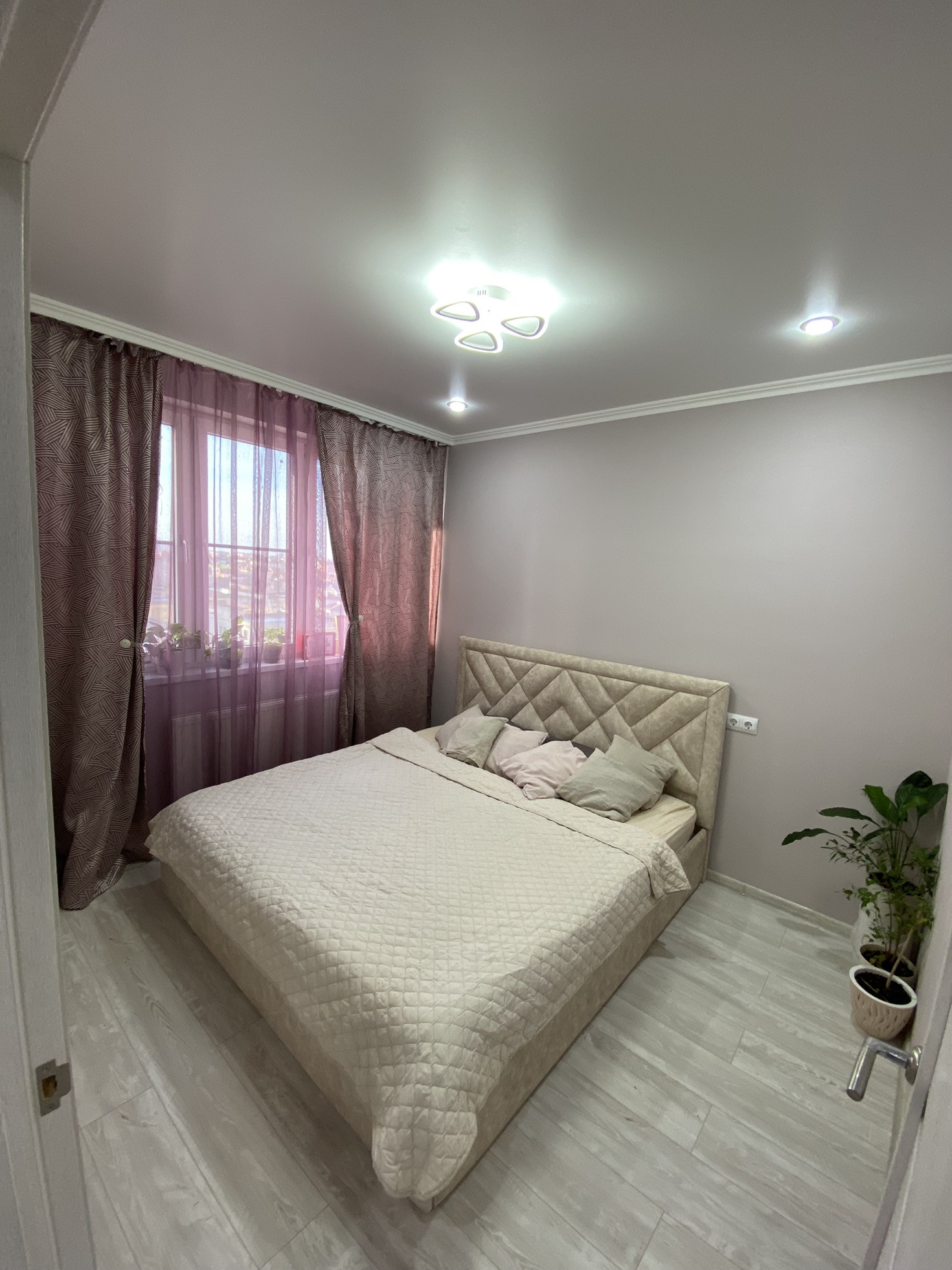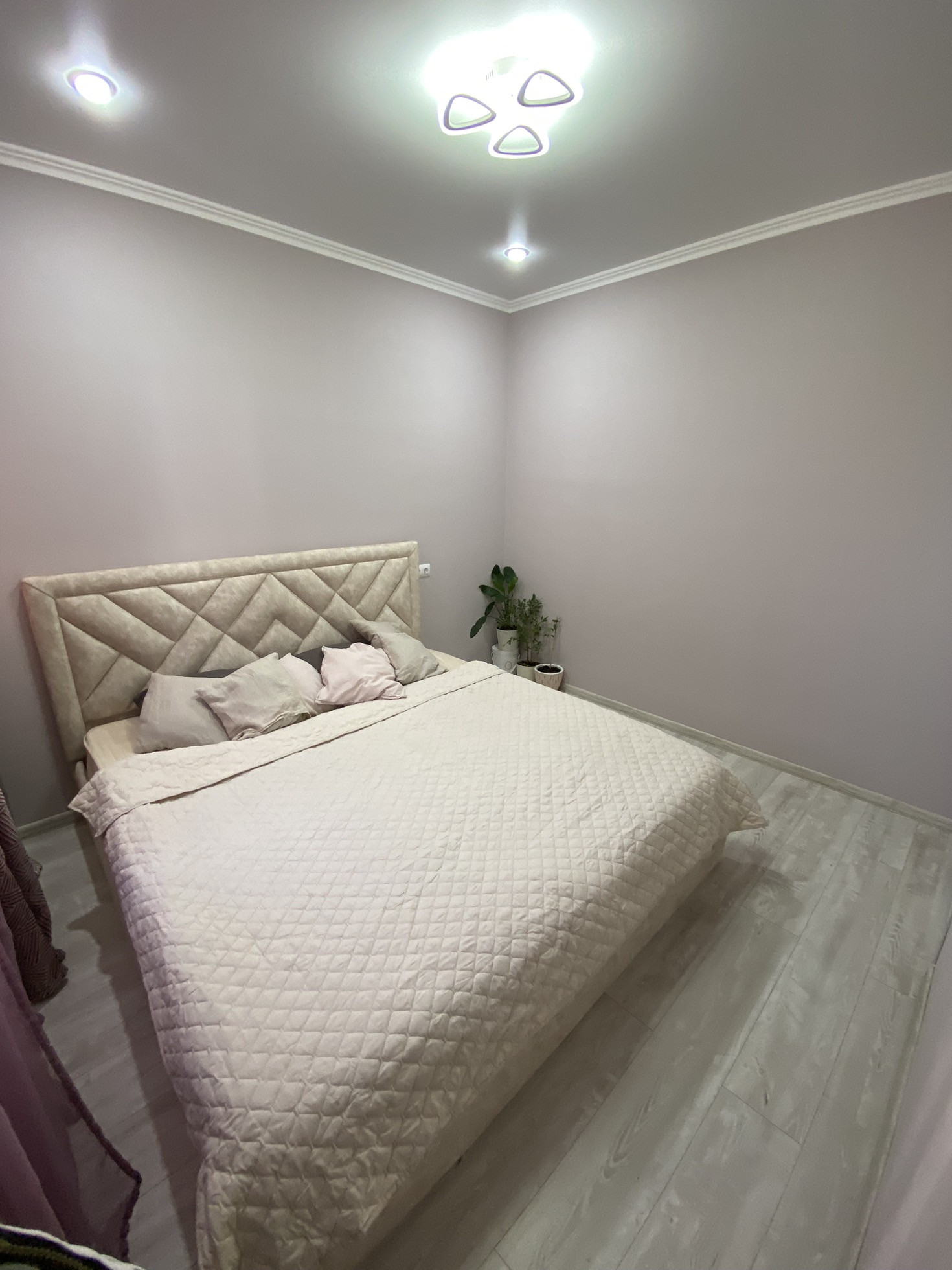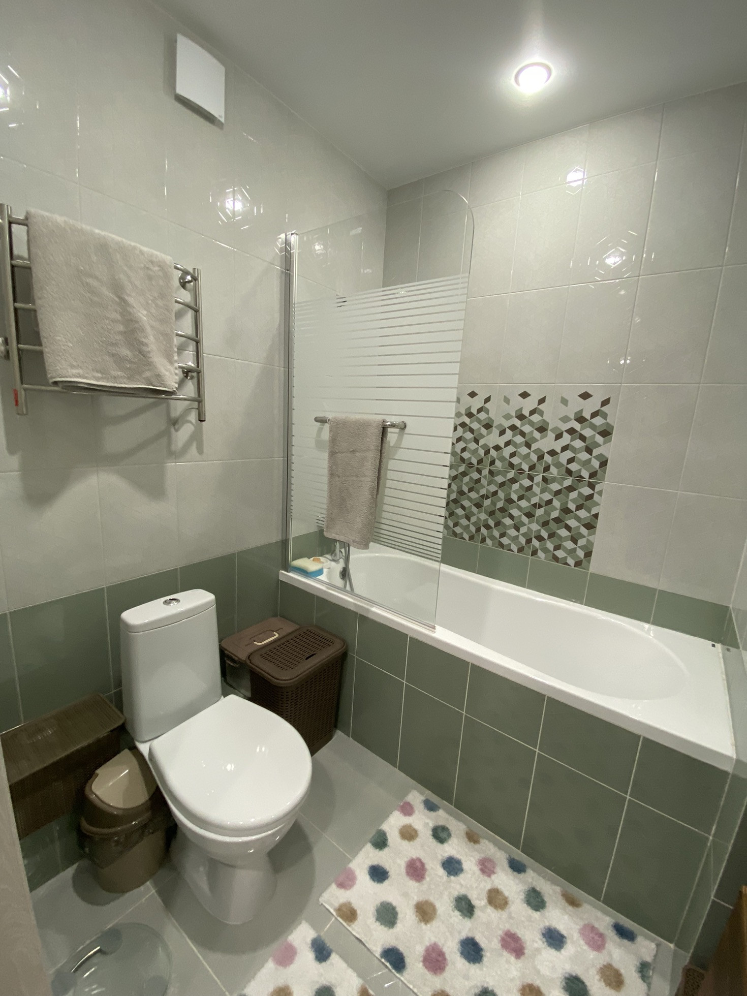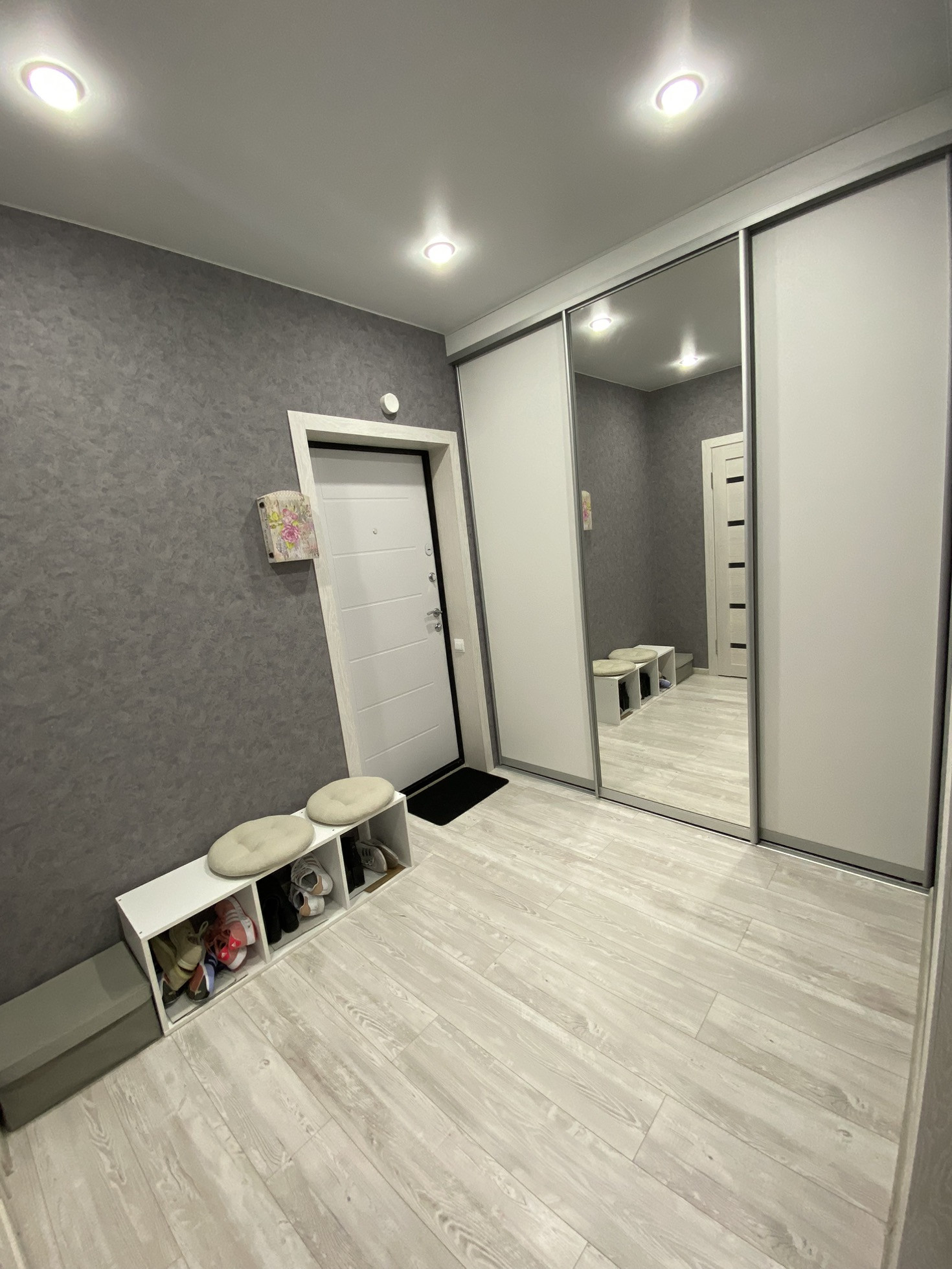 Ремонт на фото, плитка в ванной, ламинат на полу, на стенах обои, потолки натяжные с точечными светильниками и люстрами (на пульте) в коридоре установлен датчик движения. С/у совмещён. Мебель и технику частично оставлю.
