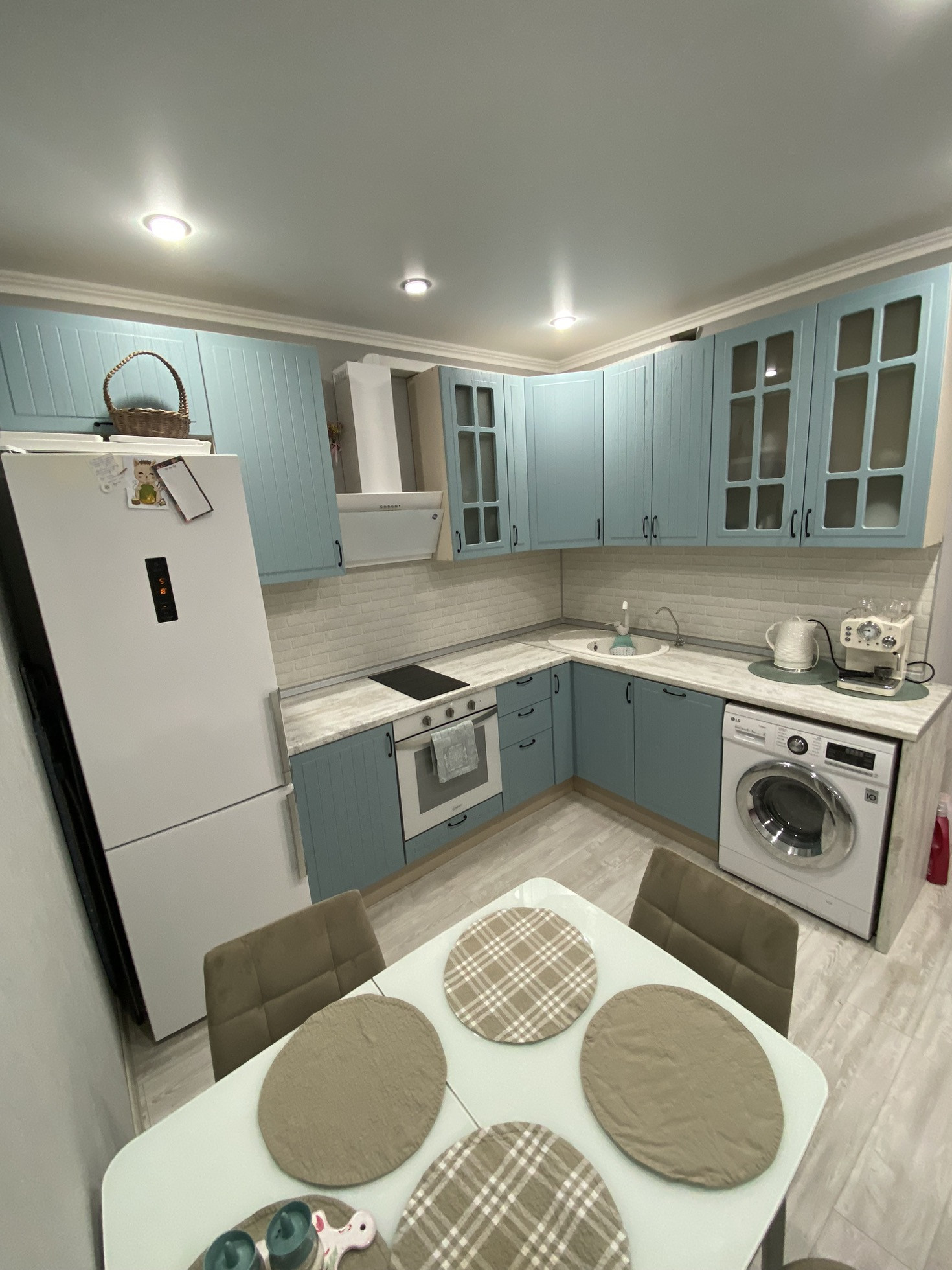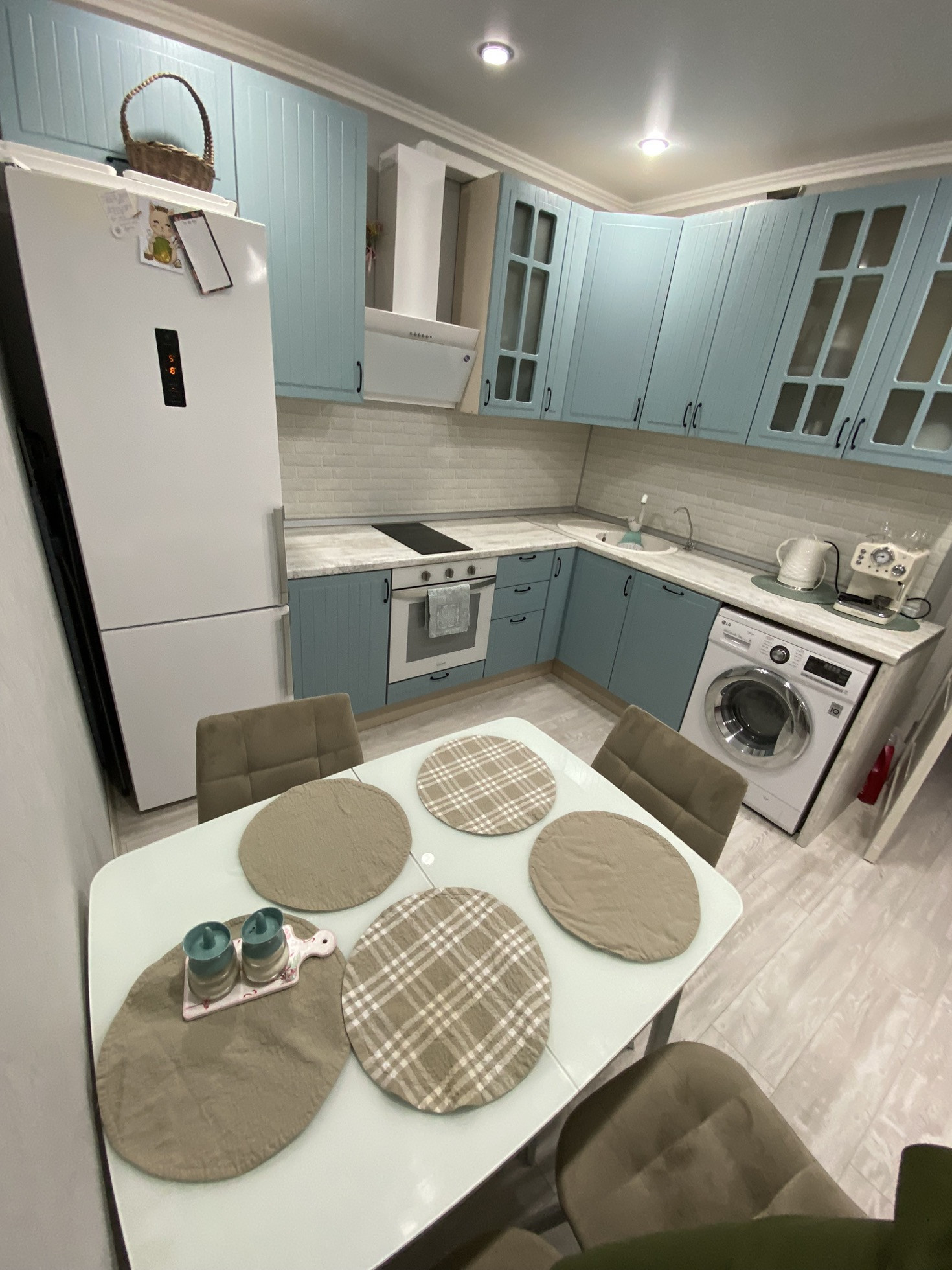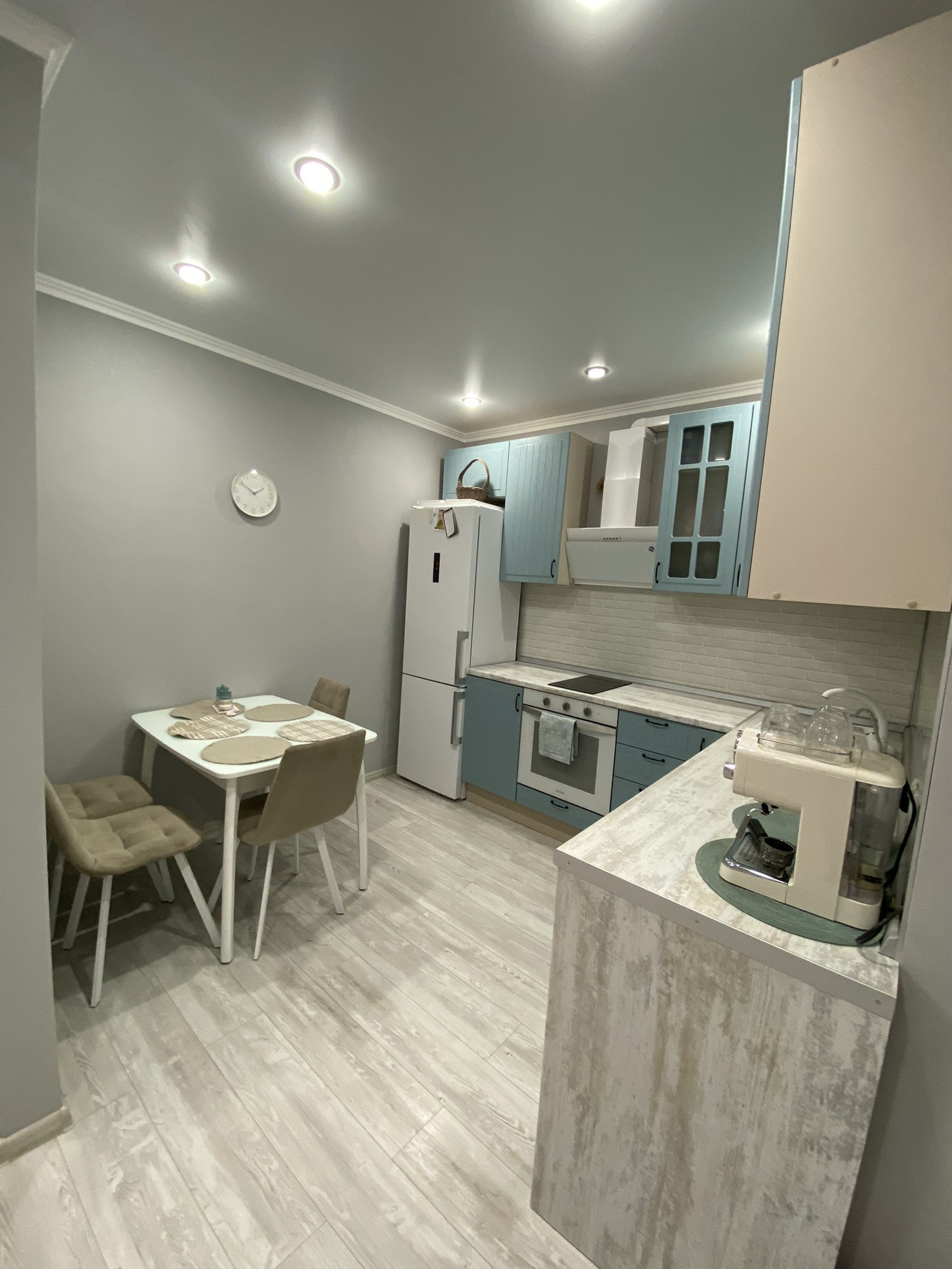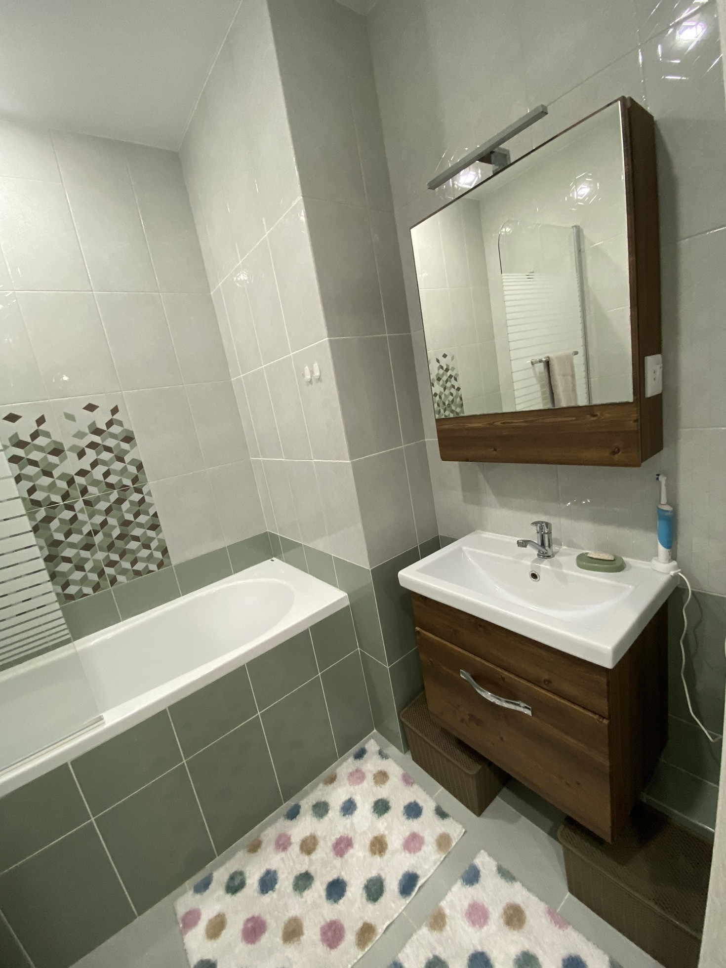 Ремонт на фото, плитка в ванной, ламинат на полу, на стенах обои, потолки натяжные с точечными светильниками и люстрами (на пульте) в коридоре установлен датчик движения. С/у совмещён. Мебель и технику частично оставлю.
