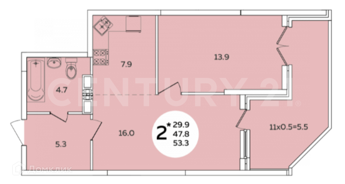 Общая площадь 53.3 м2