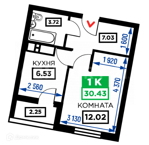 Общая площадь 29.4 м2