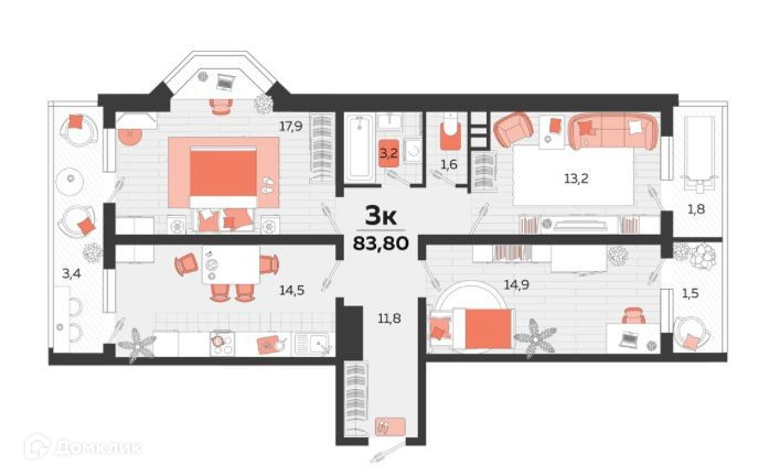 - Площадь объекта - 83,8 м2. Высота потолков - 2,7 м. Кухня - 14,5 м2. Комната - 14,9 м2. Комната - 17,9 м2. Комната - 13,2 м2. Ванная - 3,2 м2. Санузел - 1,6 м2.