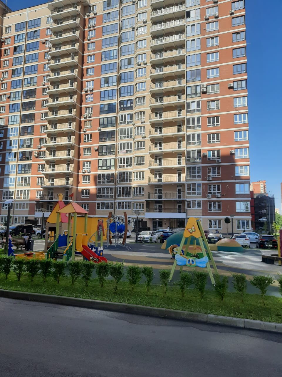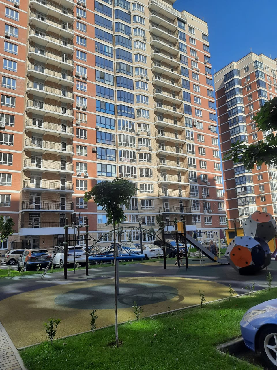 Двор отлично обустроен, газонная травка, деревья, много спортивных и детских площадок. Детский сад в 10 метрах от дома, есть многоуровневая парковка. В пяти минутах ходьбы парк Галицкого. В микрорайоне есть своя разнообразная и удобная инфраструктура: гипермаркеты, рынки, много магазинов, кулинарий, автосервис, бары.