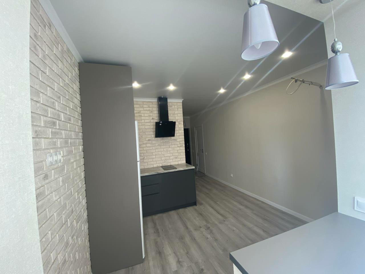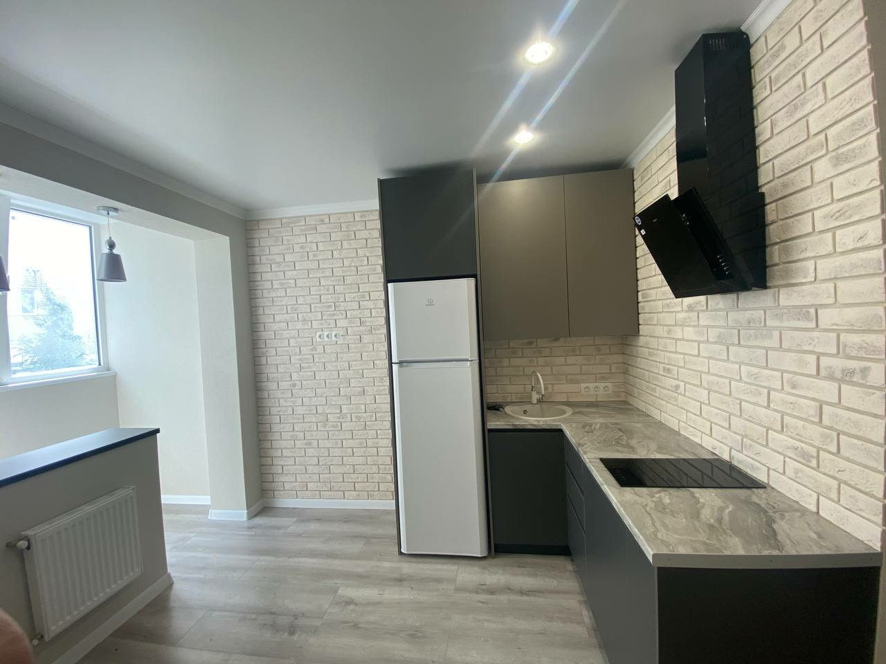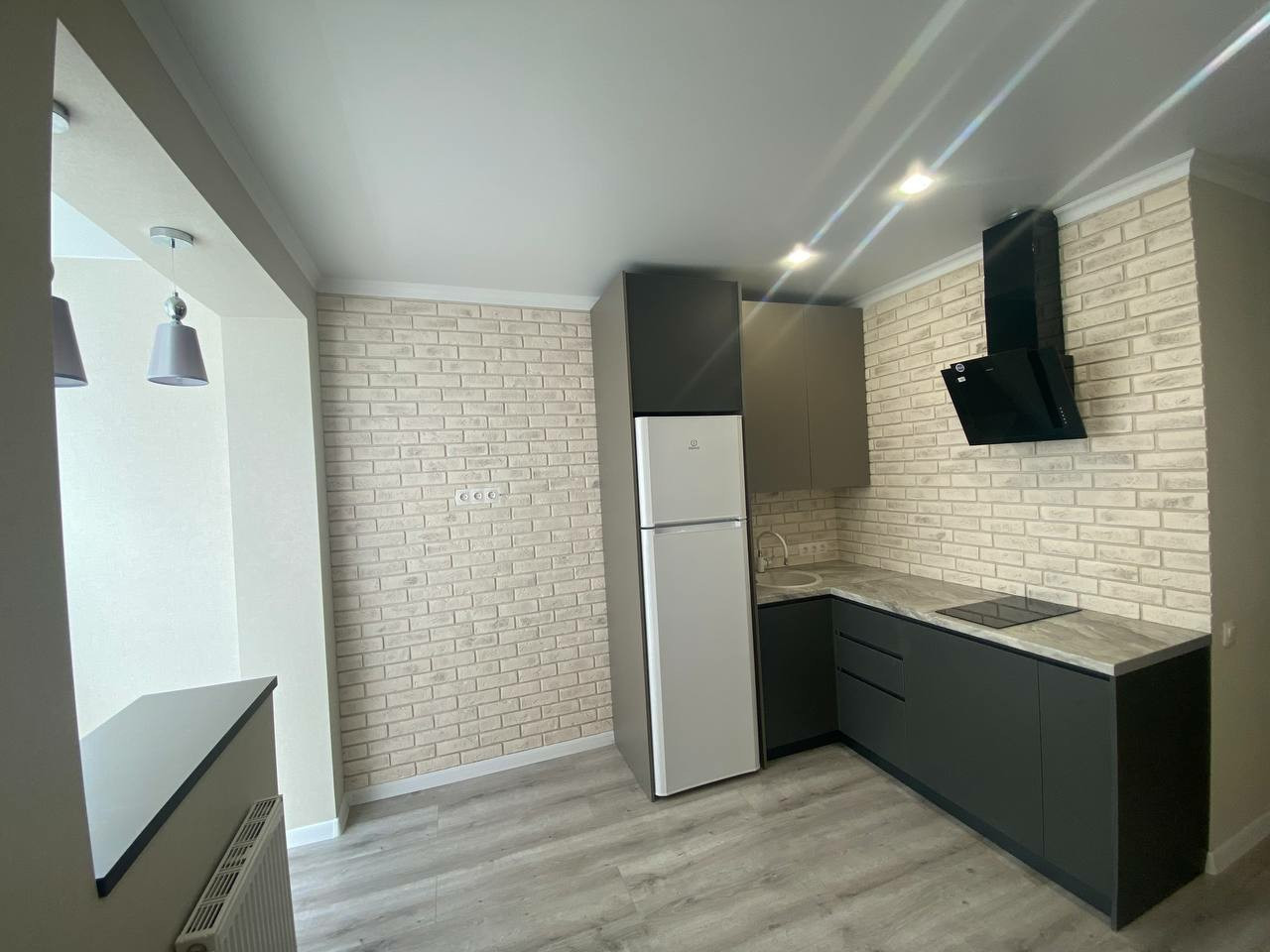 Установлена кухня по индивидуальному проекту, новый холодильник, плита, вятяжка, раковина из искусственного камня.