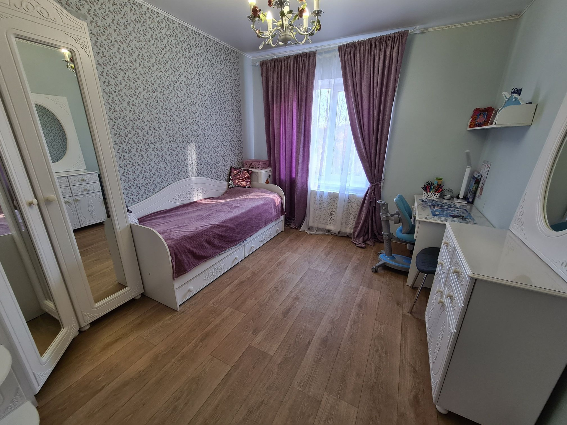 Распашонка (окна на обе стороны), просторная лоджия, 2 сплит-системы, свежий хороший ремонт. Окна детской комнаты и спальни выходят во двор и на парк Мечникова. С/у раздельный, отдельная постирочная/кладовая комната.