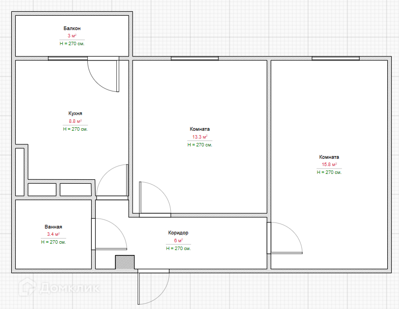 - Площадь объекта 51м2. Высота потолков 2,7м. Кухня 8,8м2. Комната 13,3м2. Комната 15,8м2.