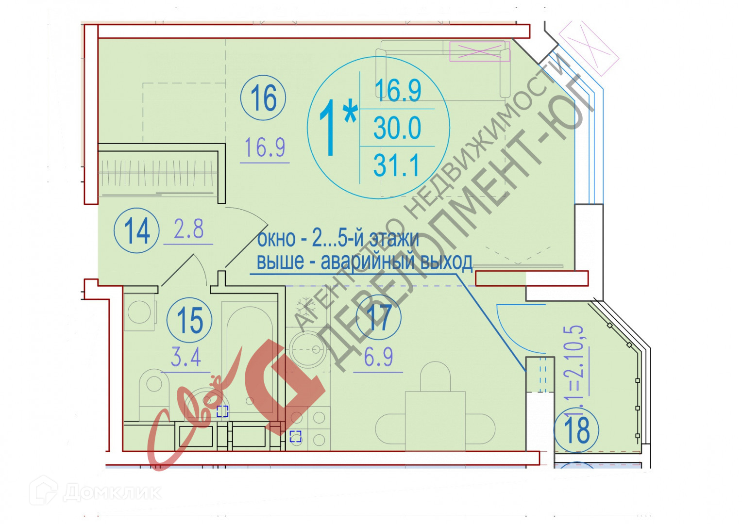 Общая площадь 30,2 кв.м. + застекленная лоджия 2,1 кв.м.