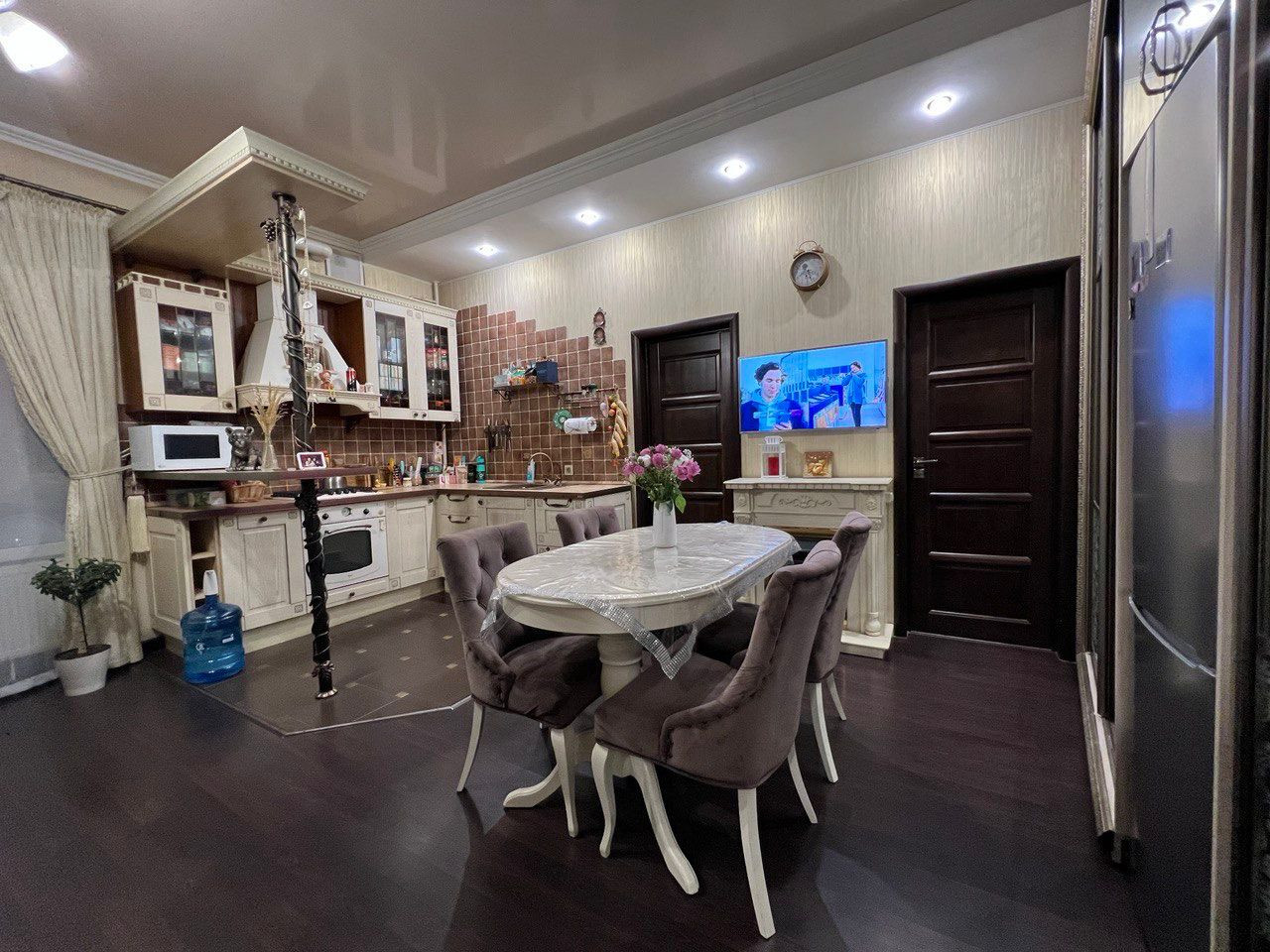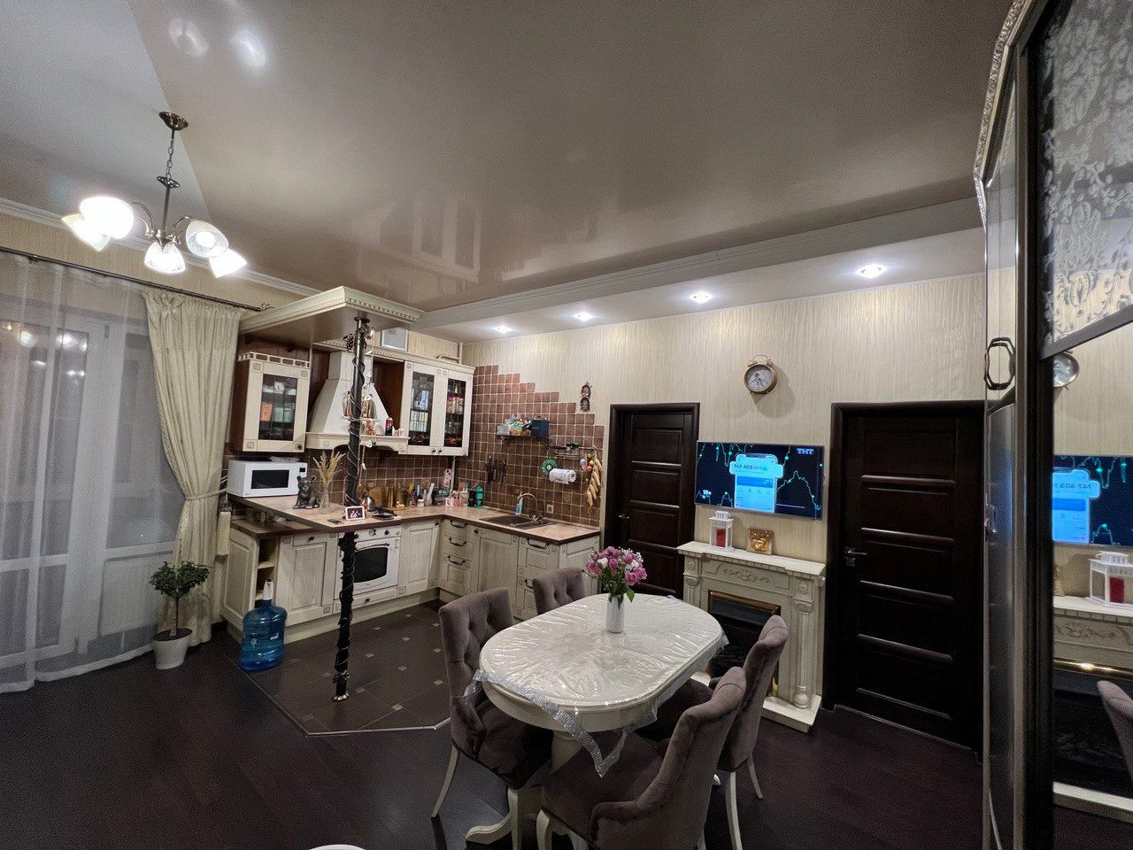 В кухне-гостиной кухонный гарнитур со встроенной бытовой техникой, посудомоечная машина диванная группа, камин, уютный диван, корпусная мебель и зона TV.
