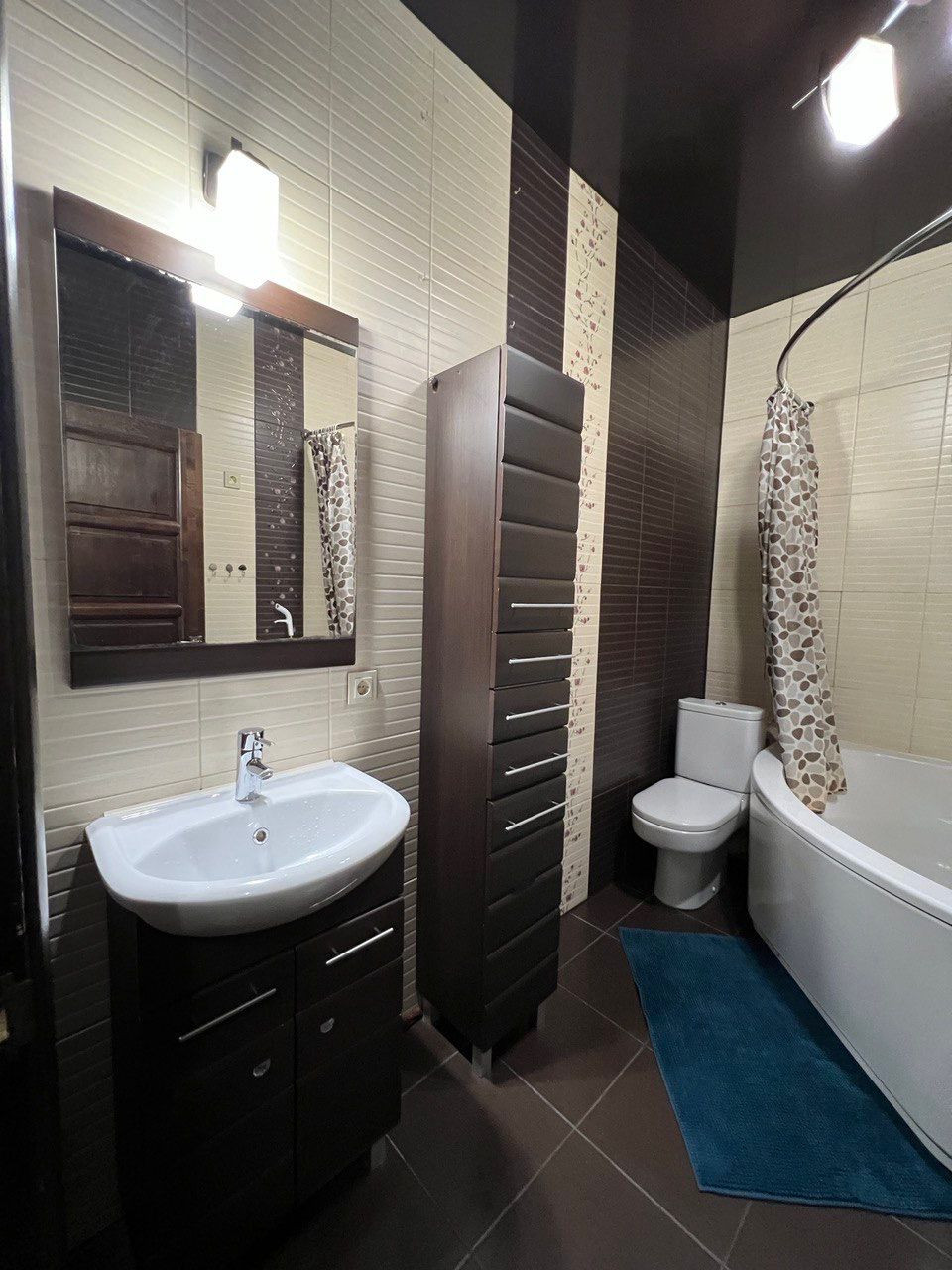 В квартире выполнен дизайнерский ремонт с использованием качественных отделочных материалов: на полу — ламинат, керамогранит, на стенах — обои, натяжные потолки со светильниками, в санузле — керамическая плитка, установлена сантехника, большая ванна, смесители, стиральная машина, межкомнатная дверь.