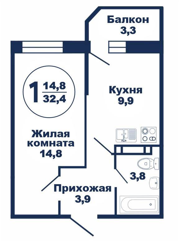 Пространство включает в себя прихожую (3,9 м2), жилую комнату (14,8 м2), кухню (9,9 м2), совмещенный санузел (3,8 м2) и просторный застекленный балкон (3,3 м2).