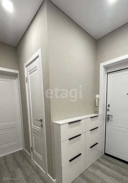 В квартире высокие потолки, натянуты матовые современные потолки с теневым профилем и встроенным освещением.