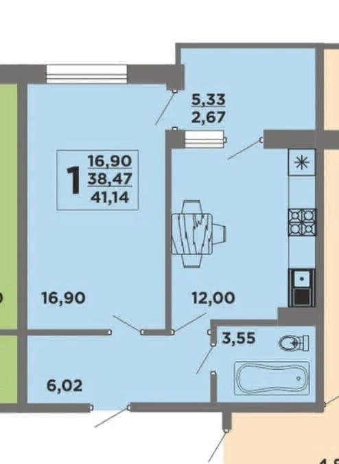 Общая площадь 41.3 м2