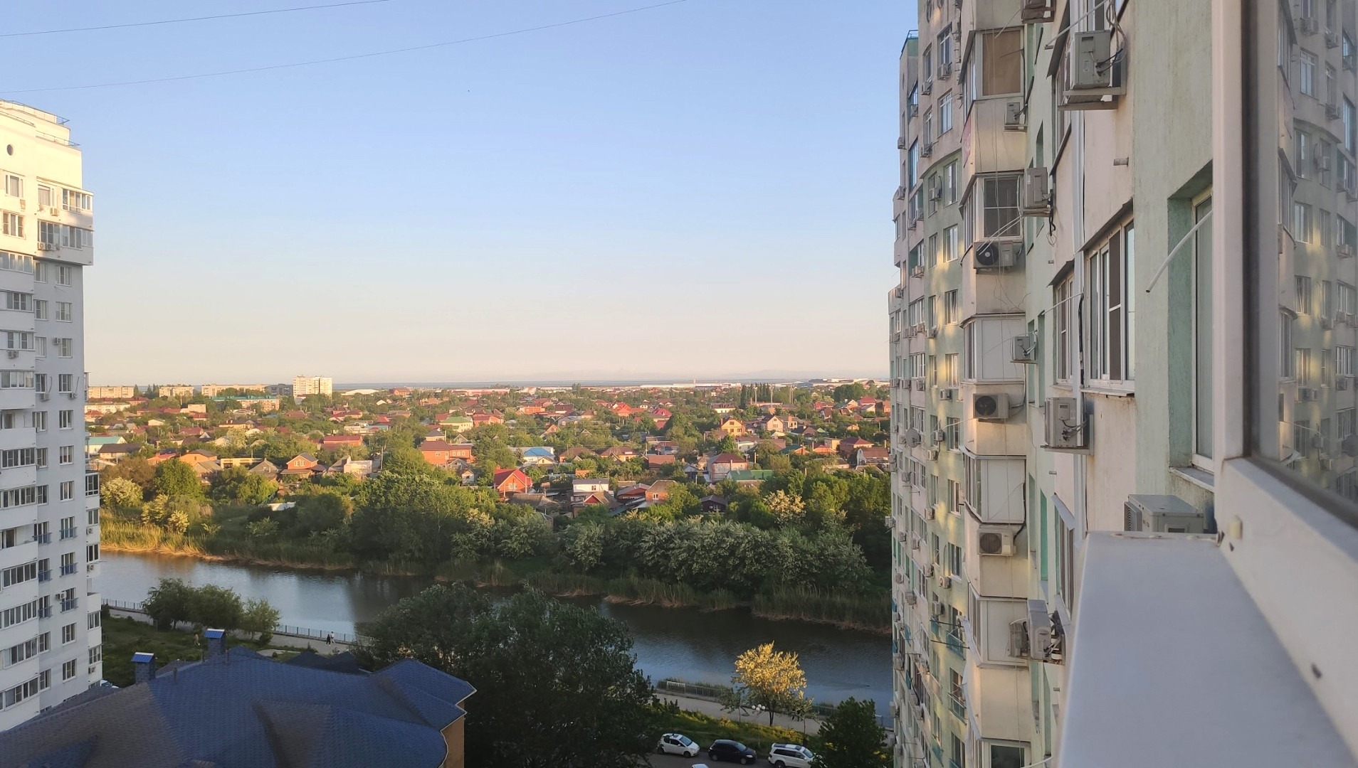 Двор со шлагбаумом, детской площадкой и выходом на благоустроенную набережную.
