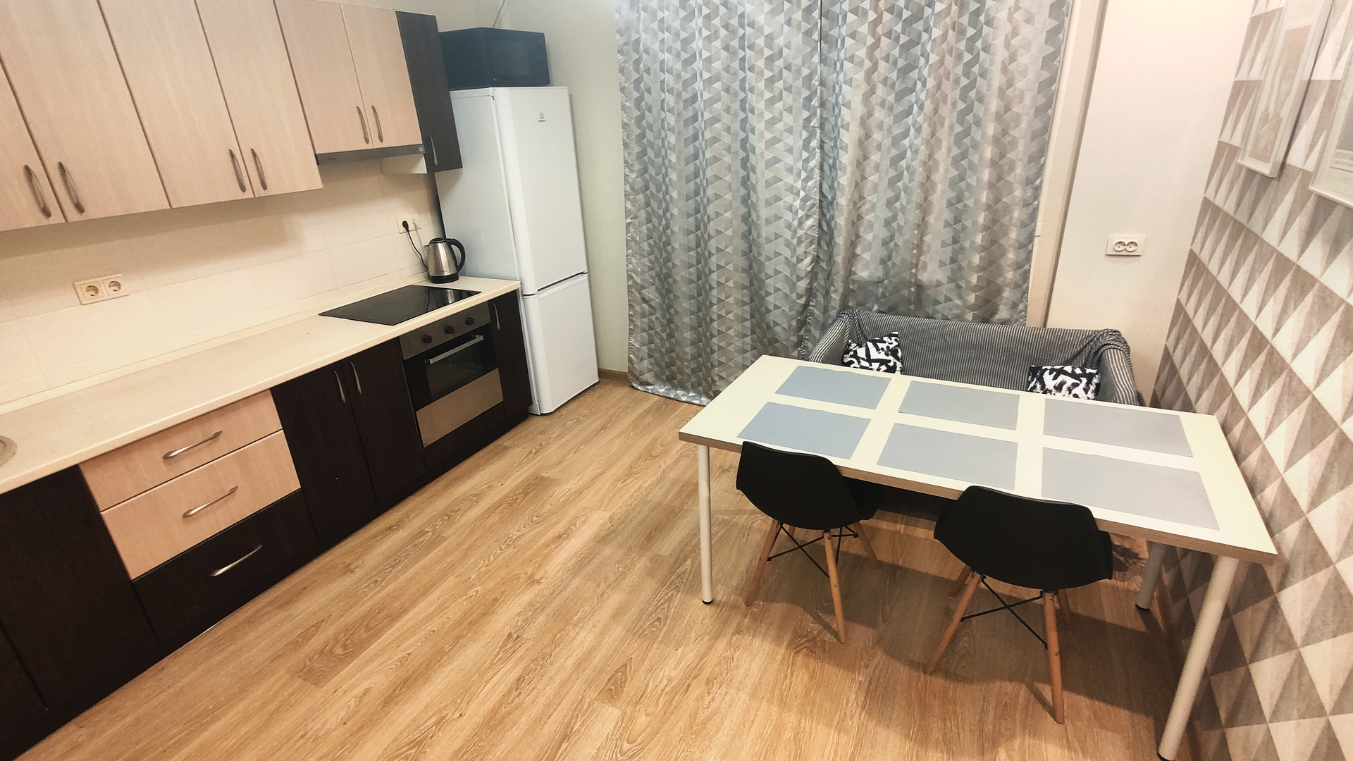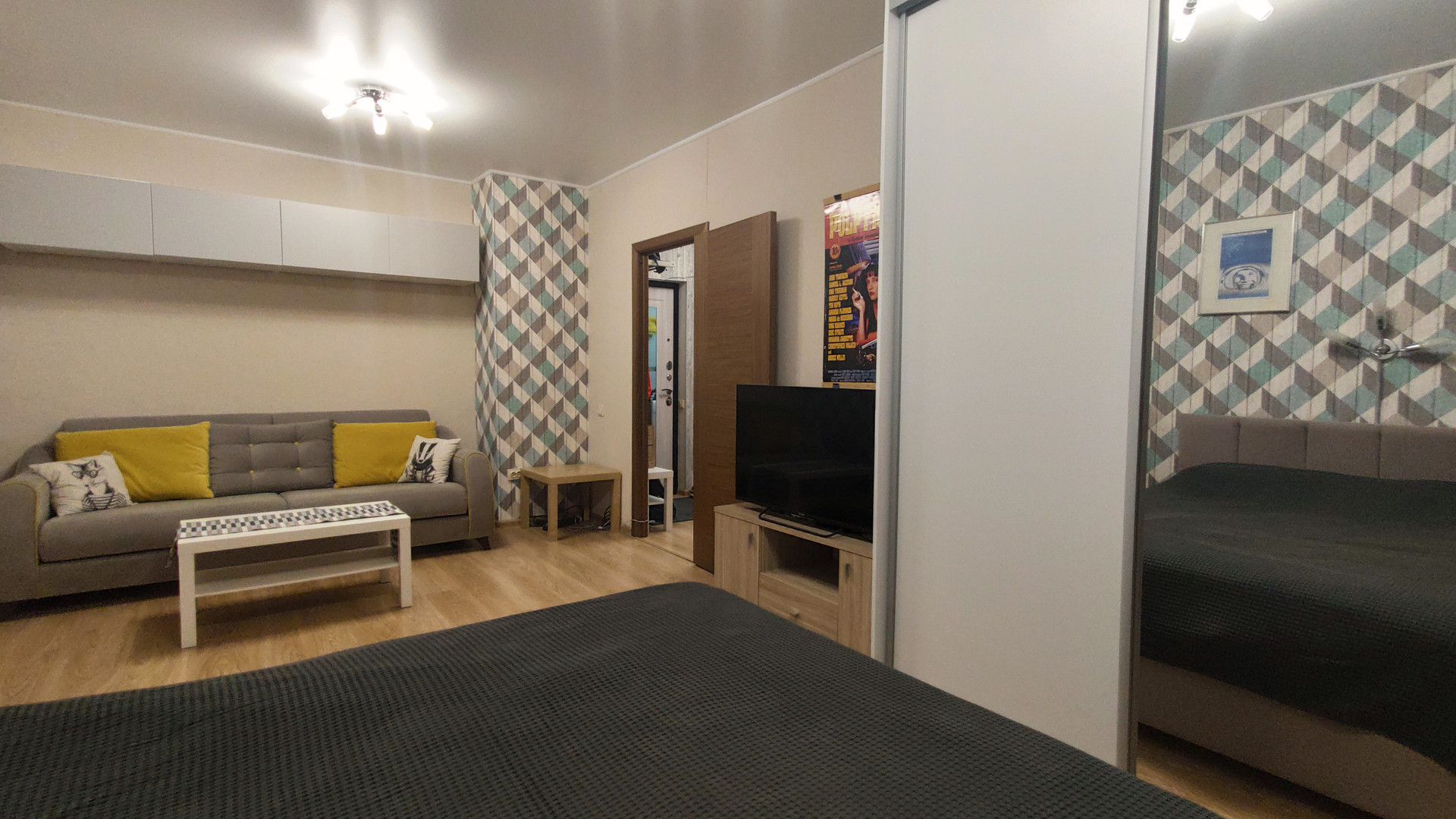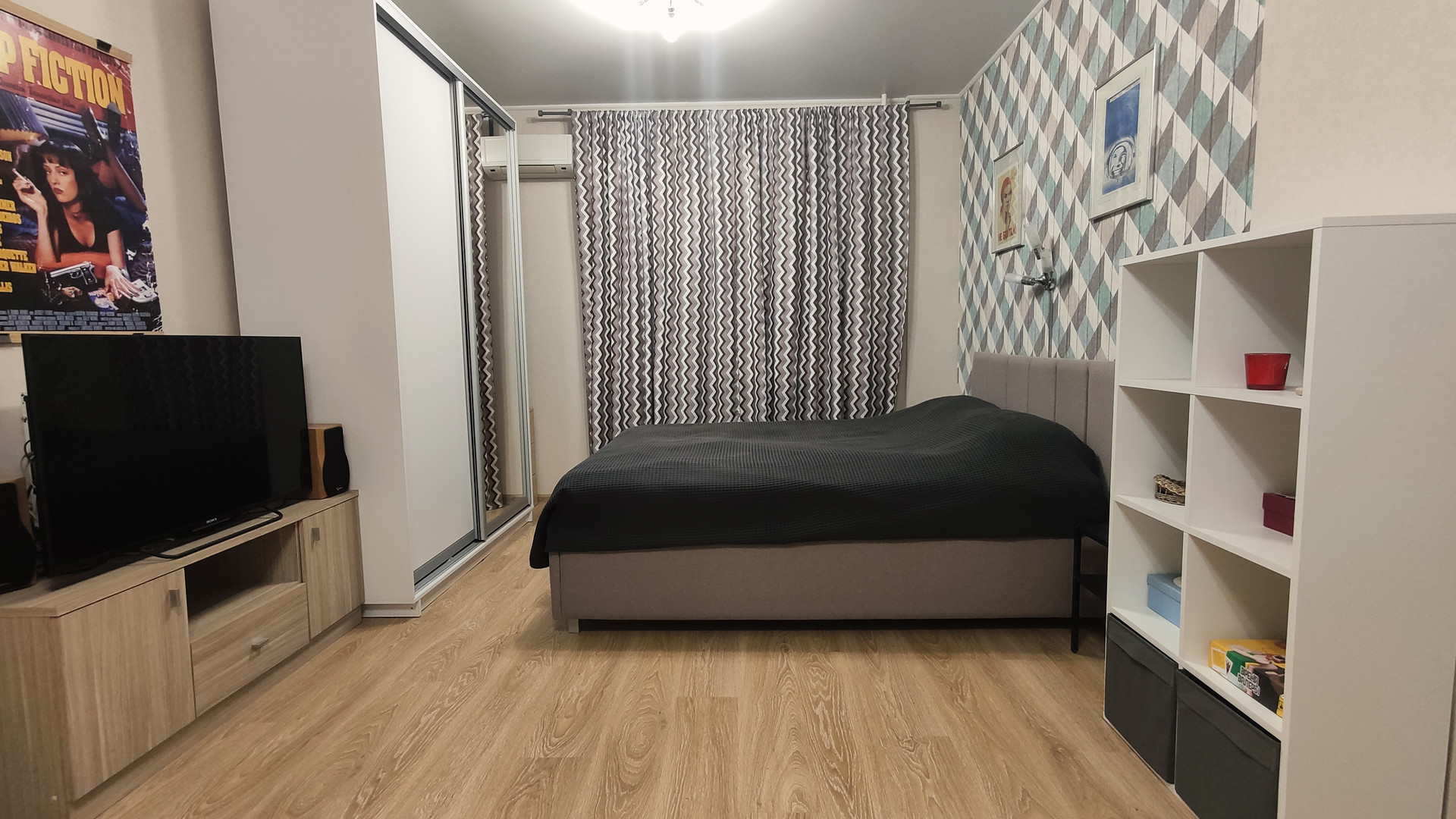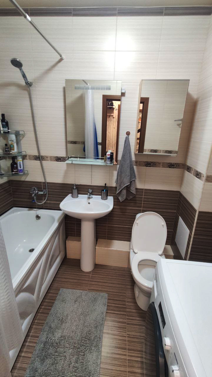 Качественный современный ремонт сделан недавно и "под себя", установлена новая металлическая входная дверь с хорошей звукоизоляцией, в комнате предусмотрены гостиная и спальная зона, просторная кухня имеет выход на утепленный и застекленный балкон, оснащенный теплым полом.