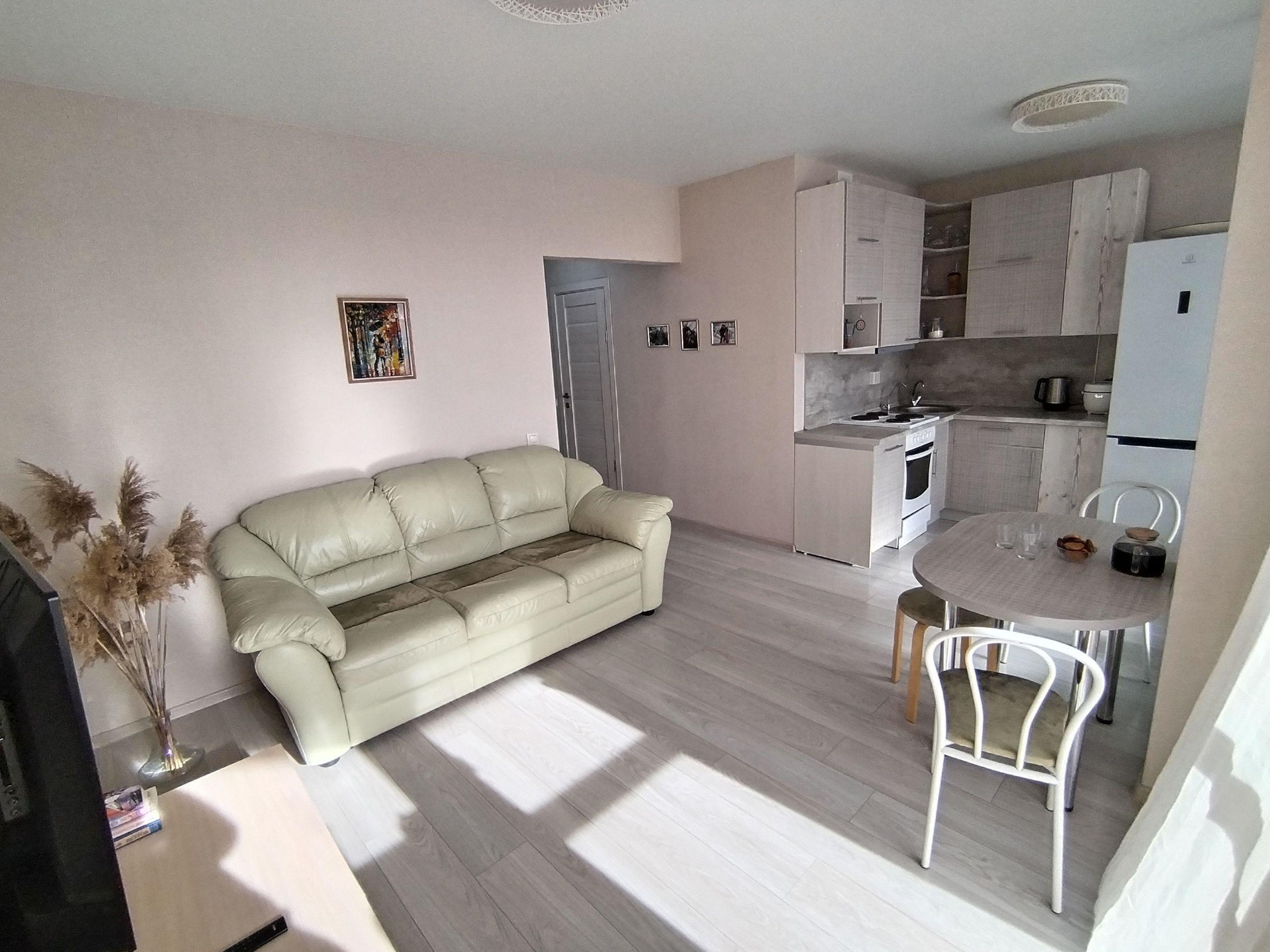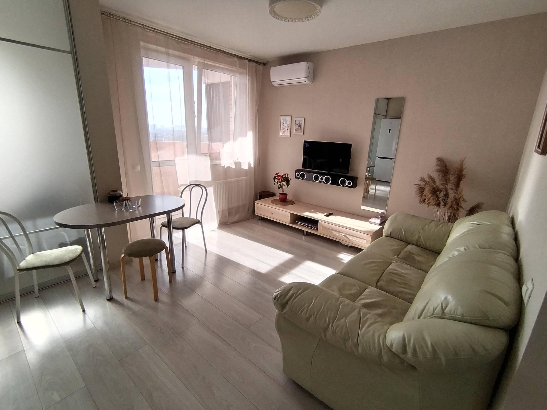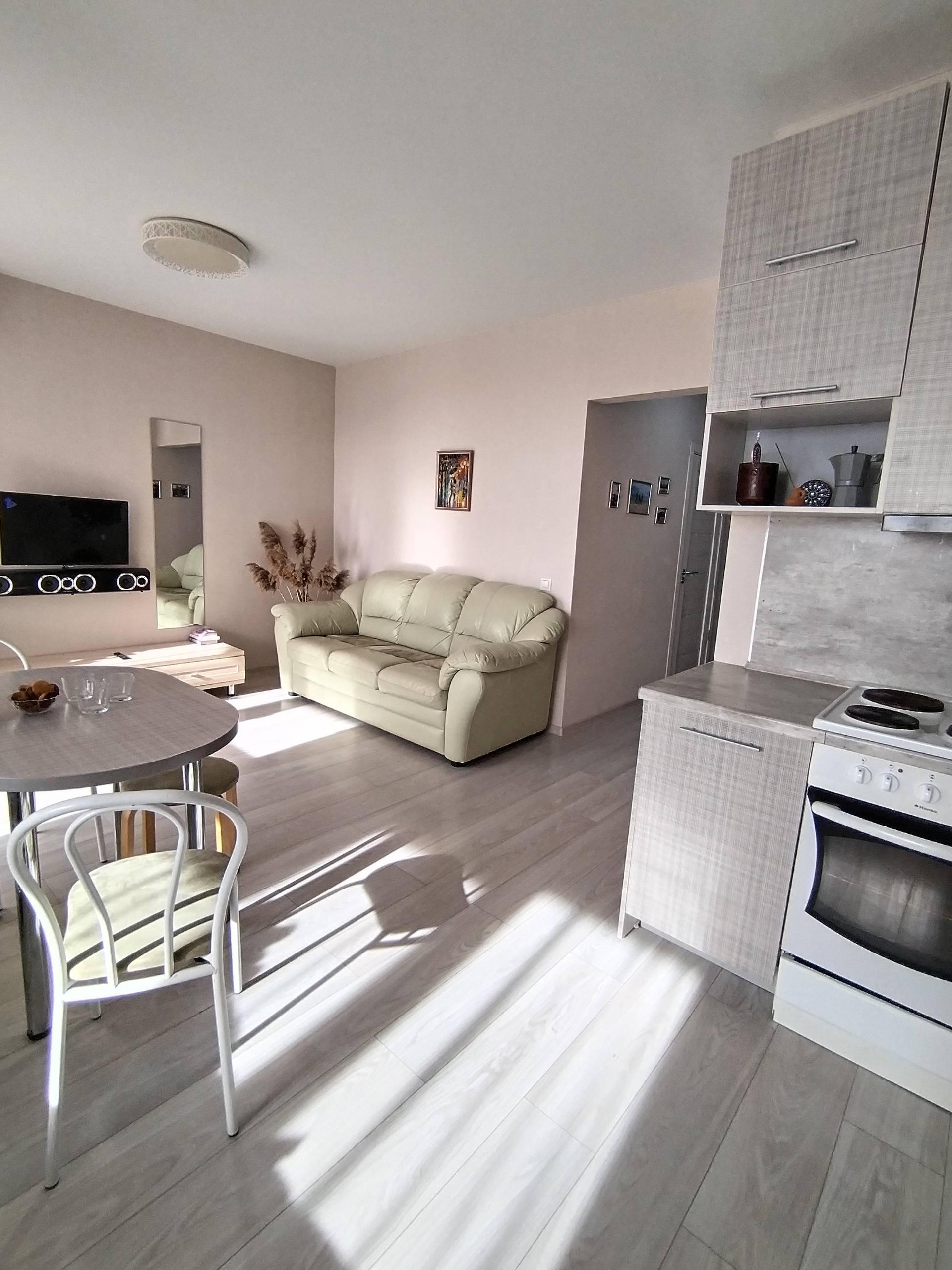 Евро 3х комнатная квартира, 2 изолированные комнаты: спальня и детская. Кухня объеденена с гостиной более 20 квадратнх метров, что очень просторно и комфортно. В коридоре сделана гардеробная. Сан узел полностью кафель, сделана душевая кабина. Установлен бойлер (чтоб 2 недели в году во время профилактики гвс не сидеть без горячей воды). Везде установлены сплит системы, встроенный кухонный гарнитур, посудомоечная машина. В собственности , без обременений. Очень большая лоджия , сделана как терраса, большую часть года проводим здесь :). Закаты и рассветы в подарок.