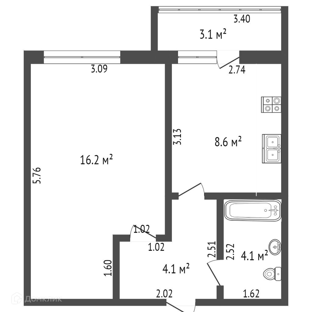 Балкон, лоджия 1 балкон