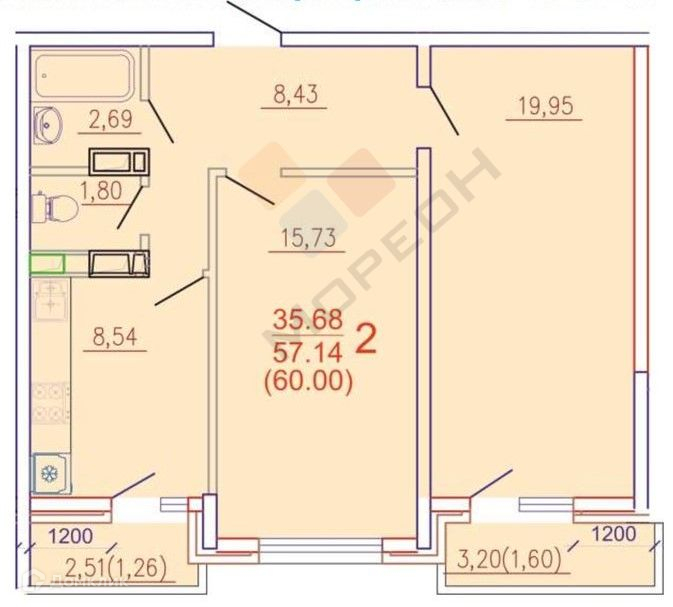 Общая площадь 57.5 м2