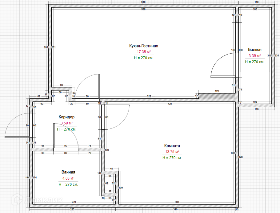 - Площадь объекта 38.7м2. Высота потолков 2,7м. Кухня-гостиная 17,35м2. Комната 13,75м2.
