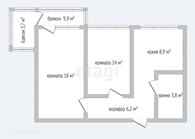 Планировка комнат 13 и 14 кв.м. удобная и эргономичная, в помещении легко разместятся все необходимые мебельные атрибуты, так как комнаты геометрической и правильной формы. Широкий Г-образный балкон 9,9 + 3,7 кв.м. застеклен (на нем можно сделать рабочую зону/кабинет).