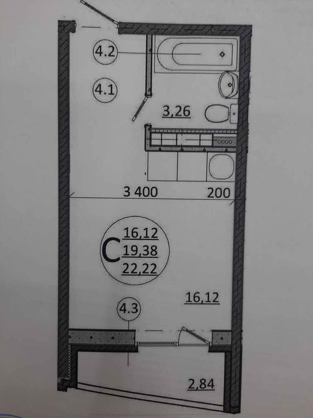 Общая площадь 22.2 м2