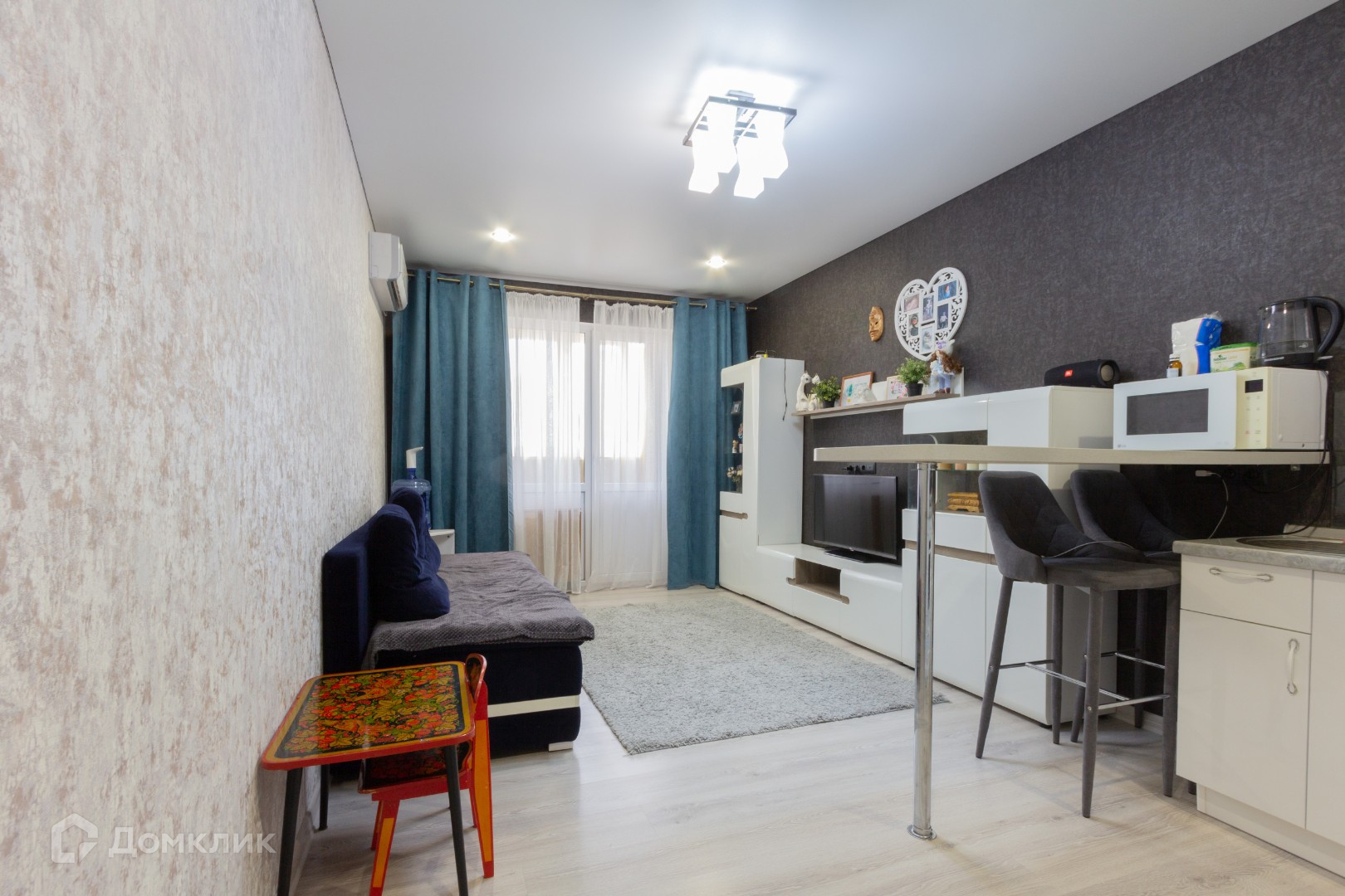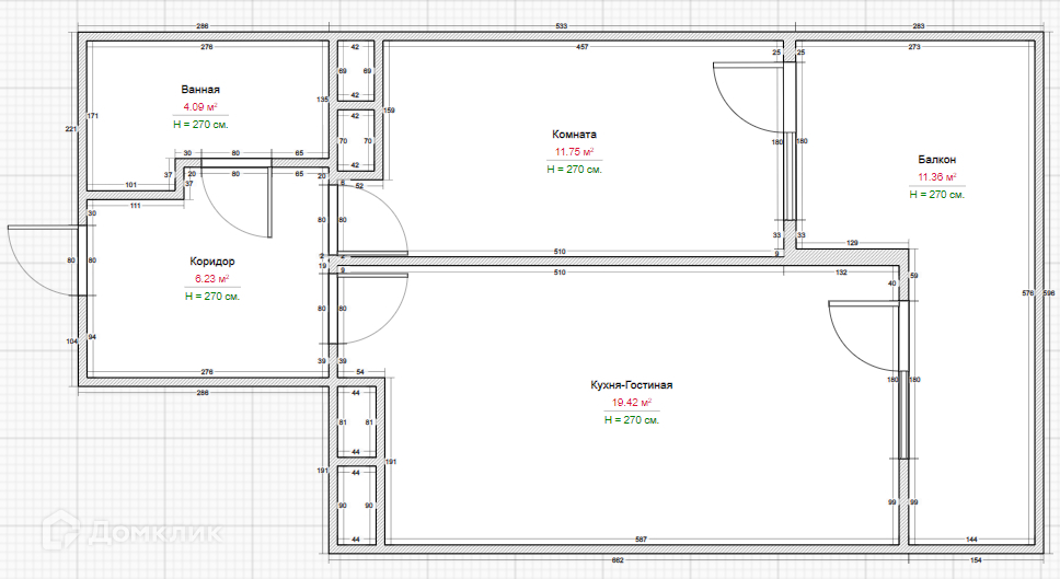 - Площадь объекта 42,2 м2. Высота потолков 2,8 м. Кухня-гостиная 19,5 м2. Комната 12,1м2.