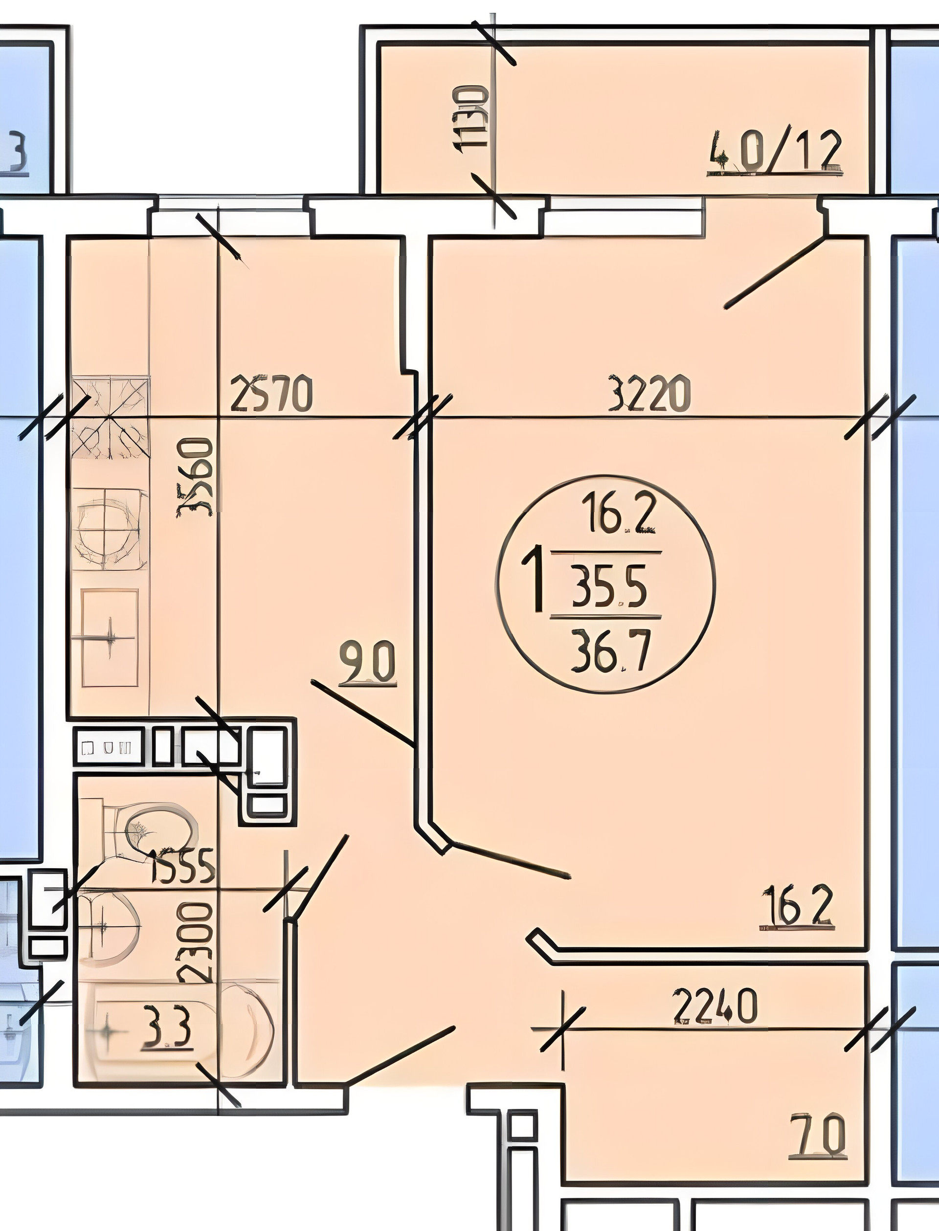 Общая площадь 36.7 м2